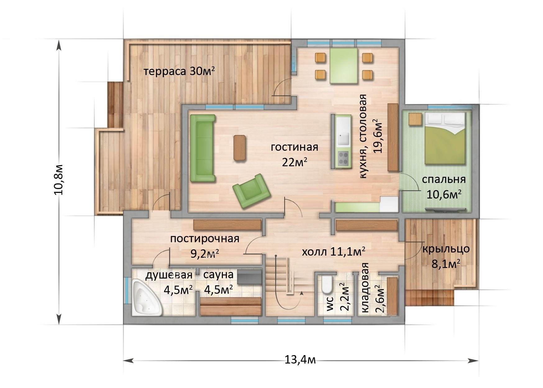 Беломорск без террасы – это коттедж имеющий 2 полноценных этажа, что является огромным преимуществом для людей ценящих пространство, т.к. высота потолков 2 этажа составляет 2.7 метра.