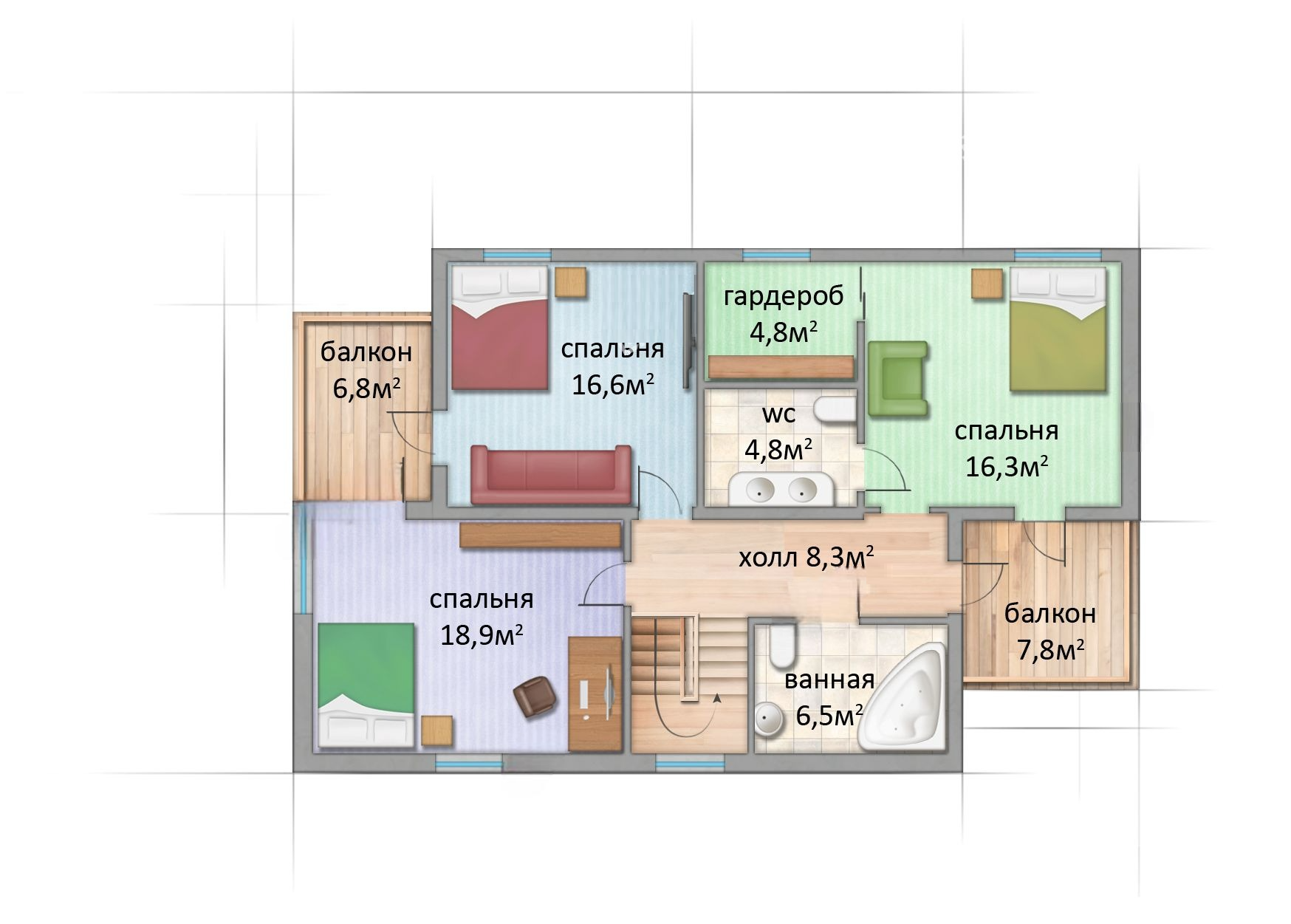 Финский дом «Беломорск» необычный и очень красивый по архитектуре проект, с множеством балконов. Выносная часть просторной гостиной, позволяет получать максимальное количество света.