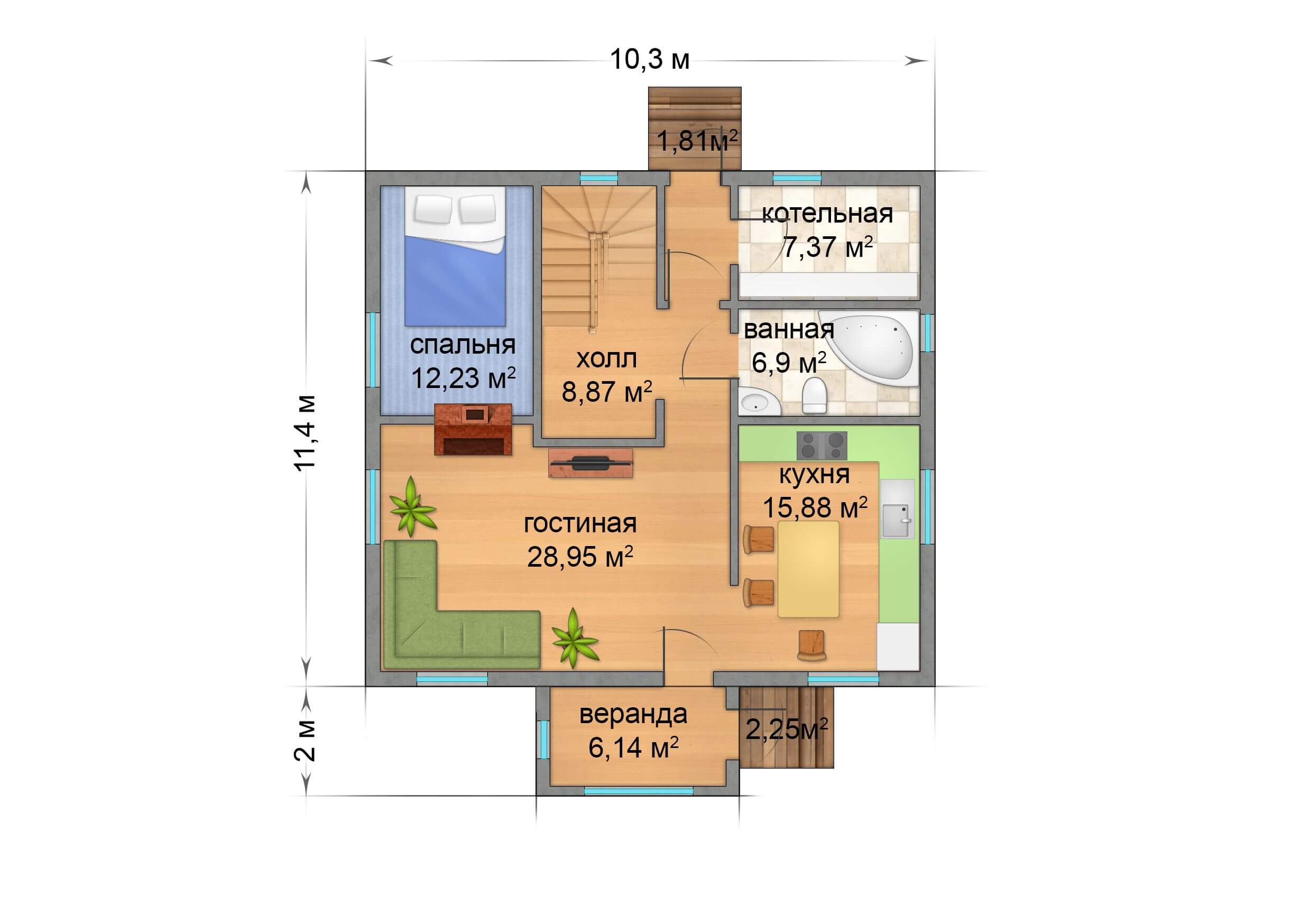 На первом этаже дома расположены: кухня 15.88 м², объединенная общей площадью с гостиной 28.95 м² с выходом на веранду 6.14 м², спальня 12.23 м², ванная комната 6.9 м², котельная 7.37 м², а также лестничный холл 8.87 м².