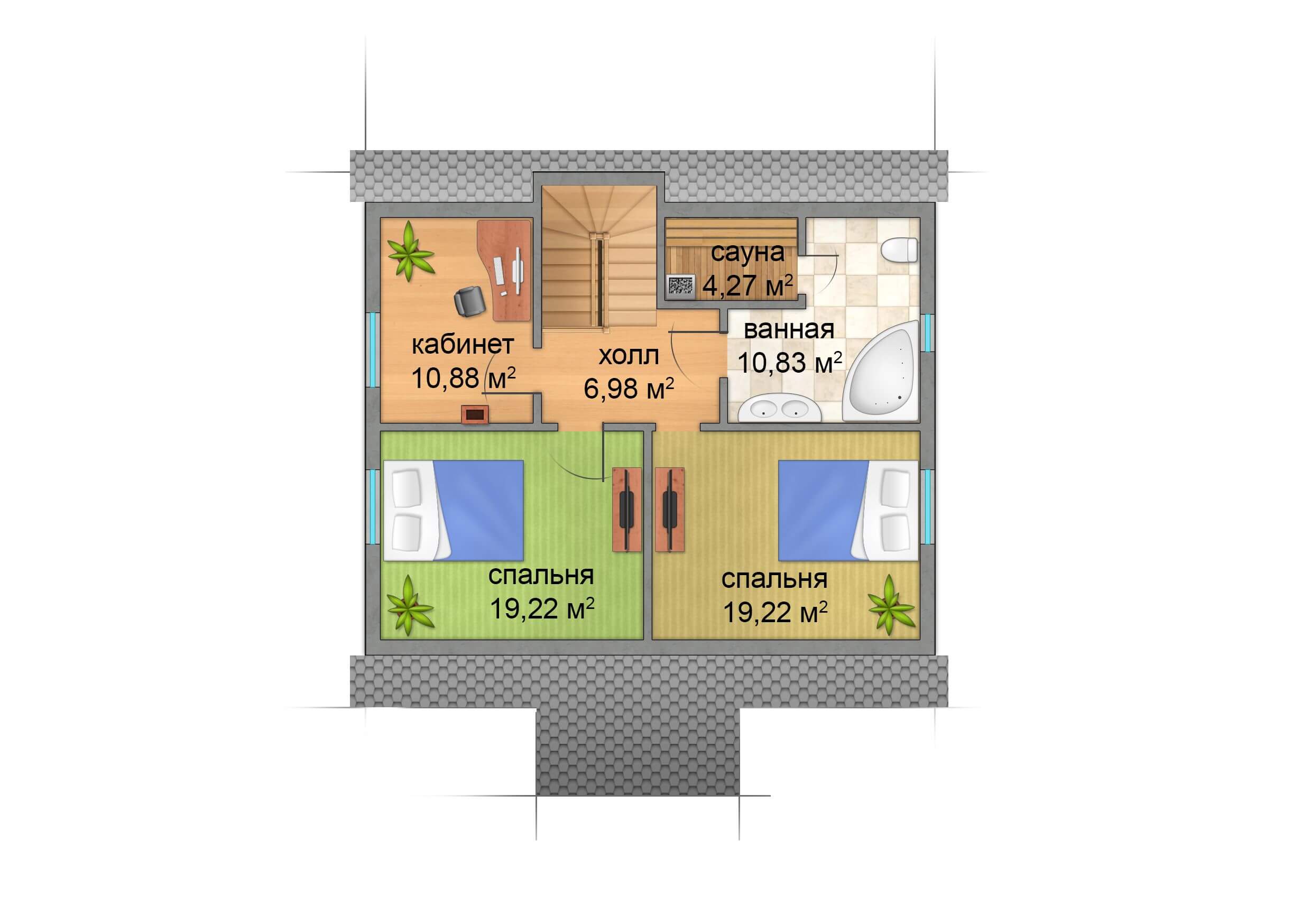 Второй этаж представлен двумя спальными комнатами по 19.22 м² каждая, кабинетом 10.88 м², большой ванной комнатой 10.83 м² и сауной 4.27 м², а также лестничным холлом 6.98 м².