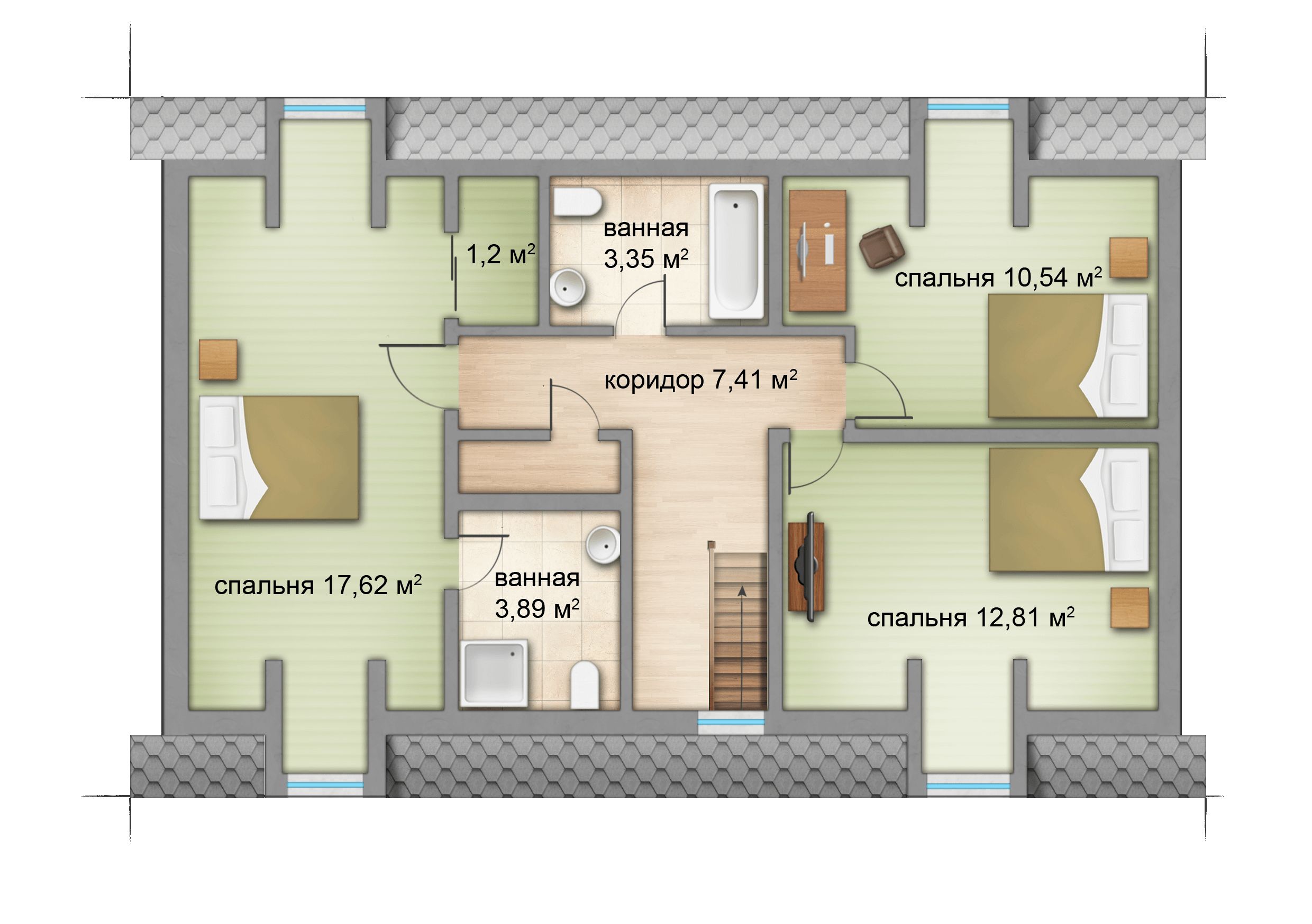 Типовые проекты каркасных домов обычно предусматривают, что на втором этаже располагаются спальни, и Ведлозеро – не исключение: три спальных комнаты, одна очень просторная и две поменьше, в которых с комфортом разместятся и хозяева, и гости. На этом же этаже располагаются два санузла – с ванной и душевой, а для хранения вещей предусмотрена гардеробная.