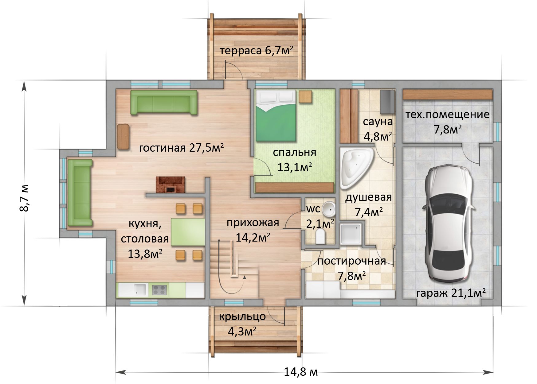Так же на первом этаже расположены помещения, носящие функциональный характер: Сауна площадью 4,8 м.кв, душевая площадью 7,4 м.кв, постирочная площадью 7,8 м.кв и сан.узел с обособленным входом.