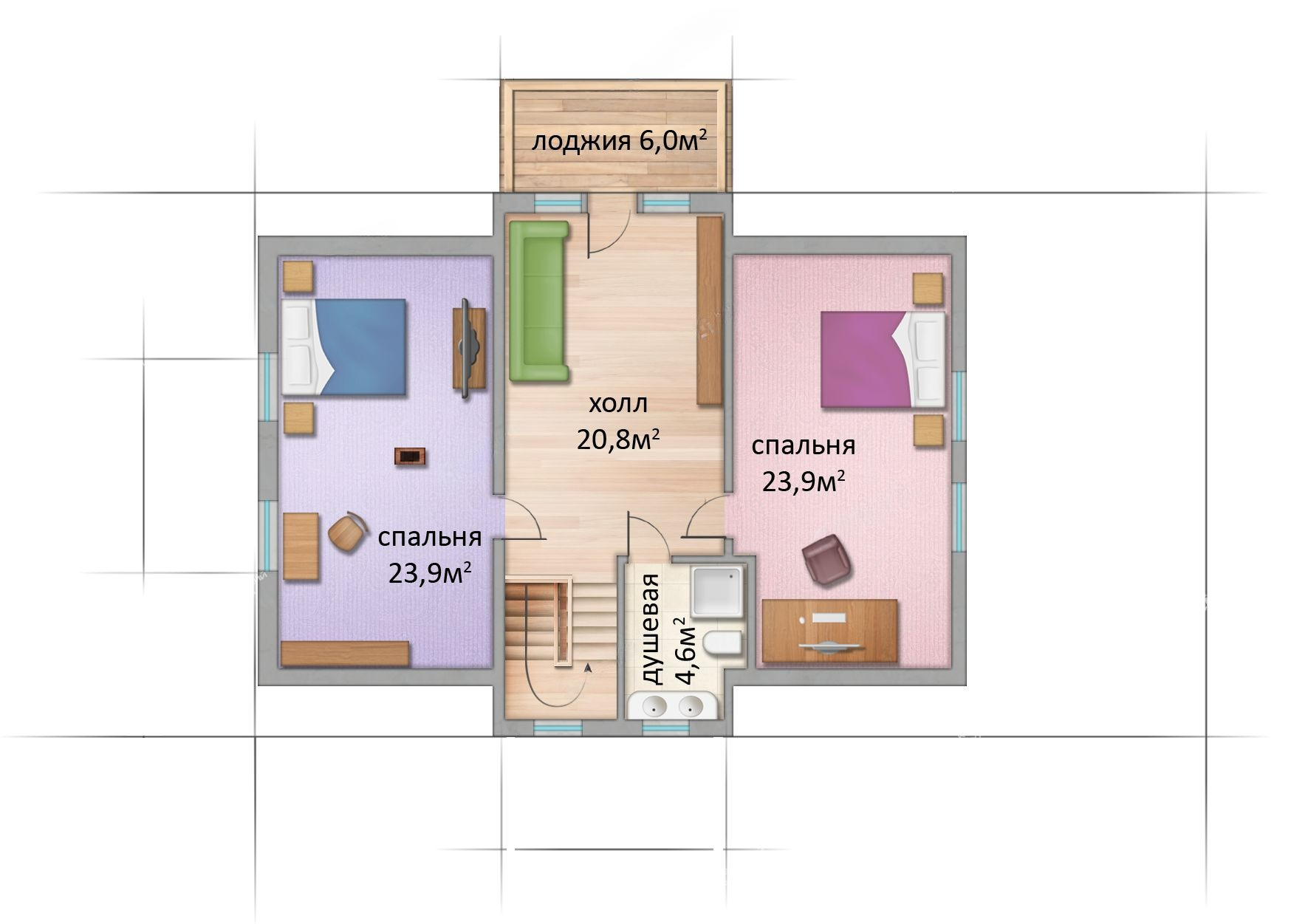 На втором этаже проектом предусмотрены две просторные спальни площадью 23 м.кв, расположенные напротив друг друга, с выходом в холл. Так же на втором этаже есть ванная комната и лоджия.