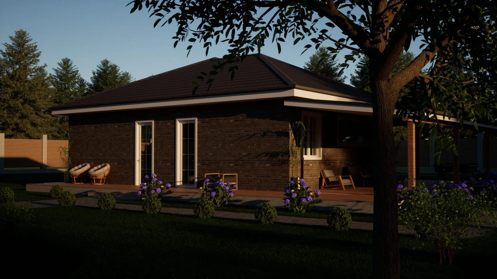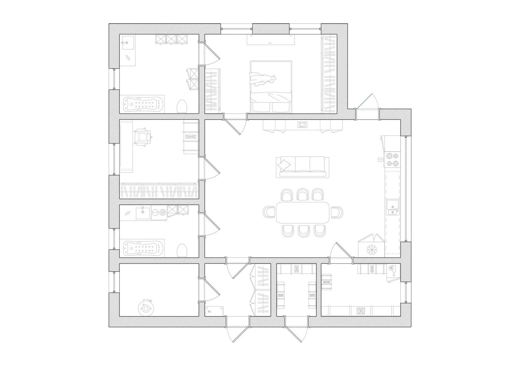 Проектом предусмотрено наличие в доме гаража с доступом в подсобное помещение, а также два входа в дом.