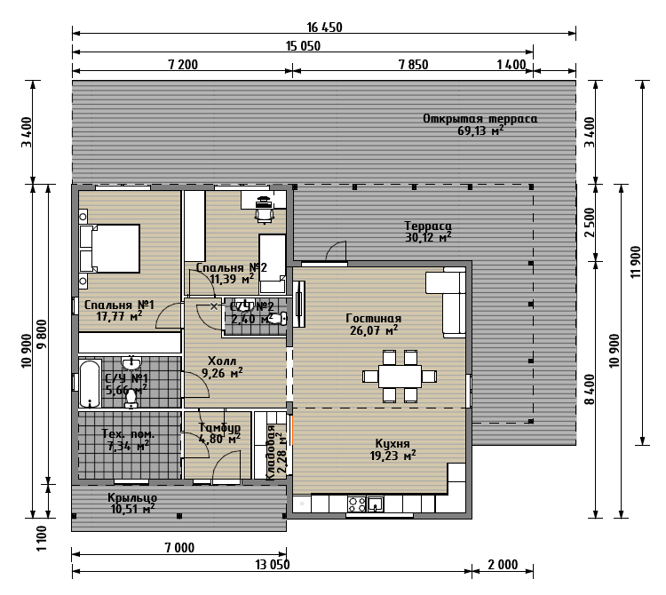 Общая площадь дома - 146,75м2 (включая площадь крыльца и крытой террасы,без учета площади открытой террасы)