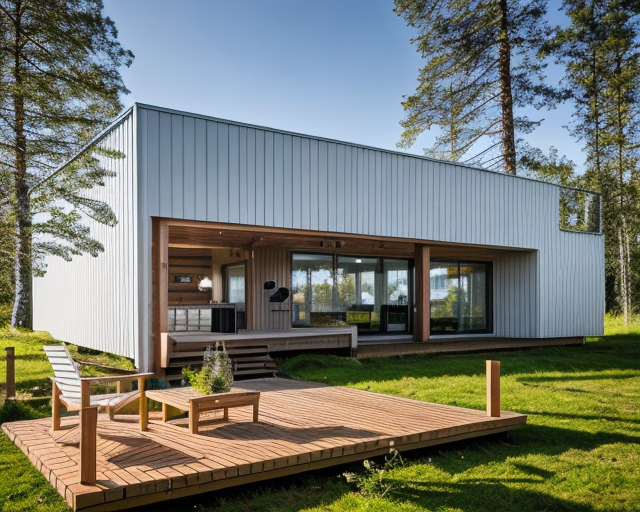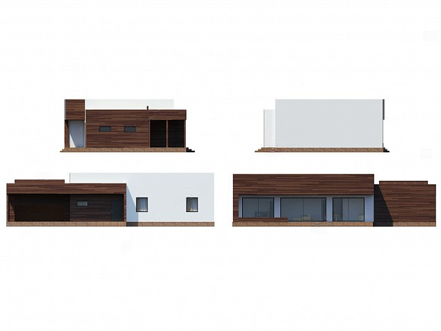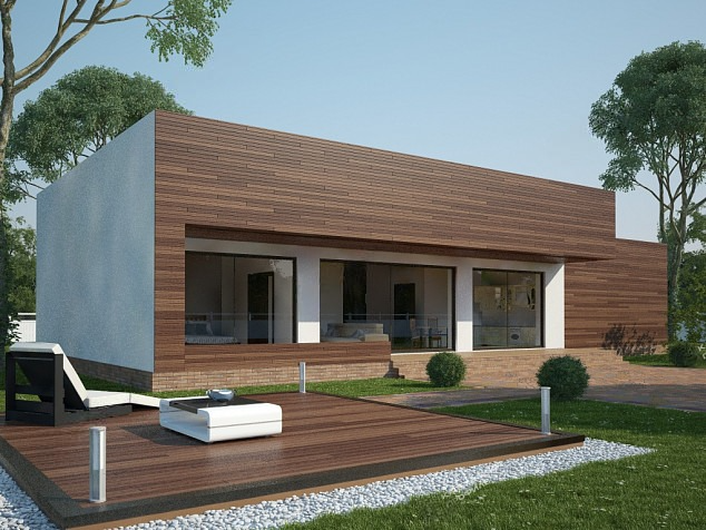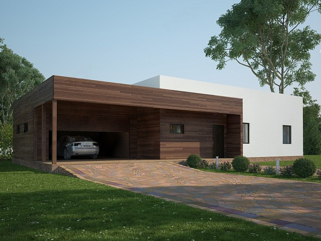 Одноэтажный дом с простой и функциональной планировкой. Несмотря на «одноуровневость» здания стильный экстерьер делает его доминантой участка. Нестандартное оформление фасада поперечными панелями придают современному облику уютный и домашний вид.