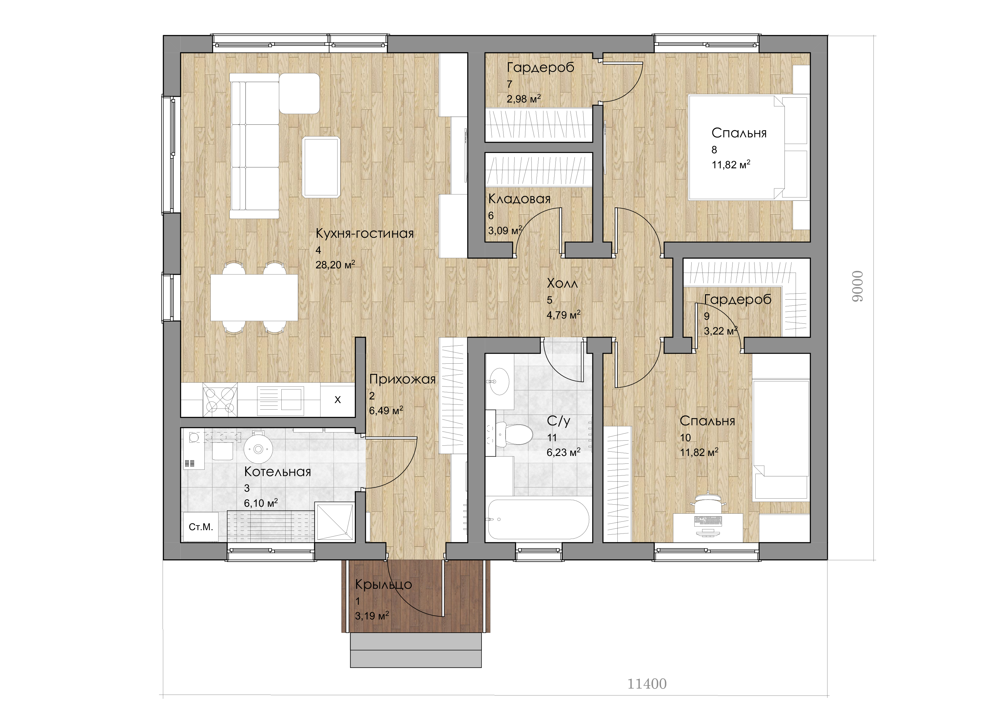 •Общая площадь 85 кв.м. + крыльцо 3 кв.м.