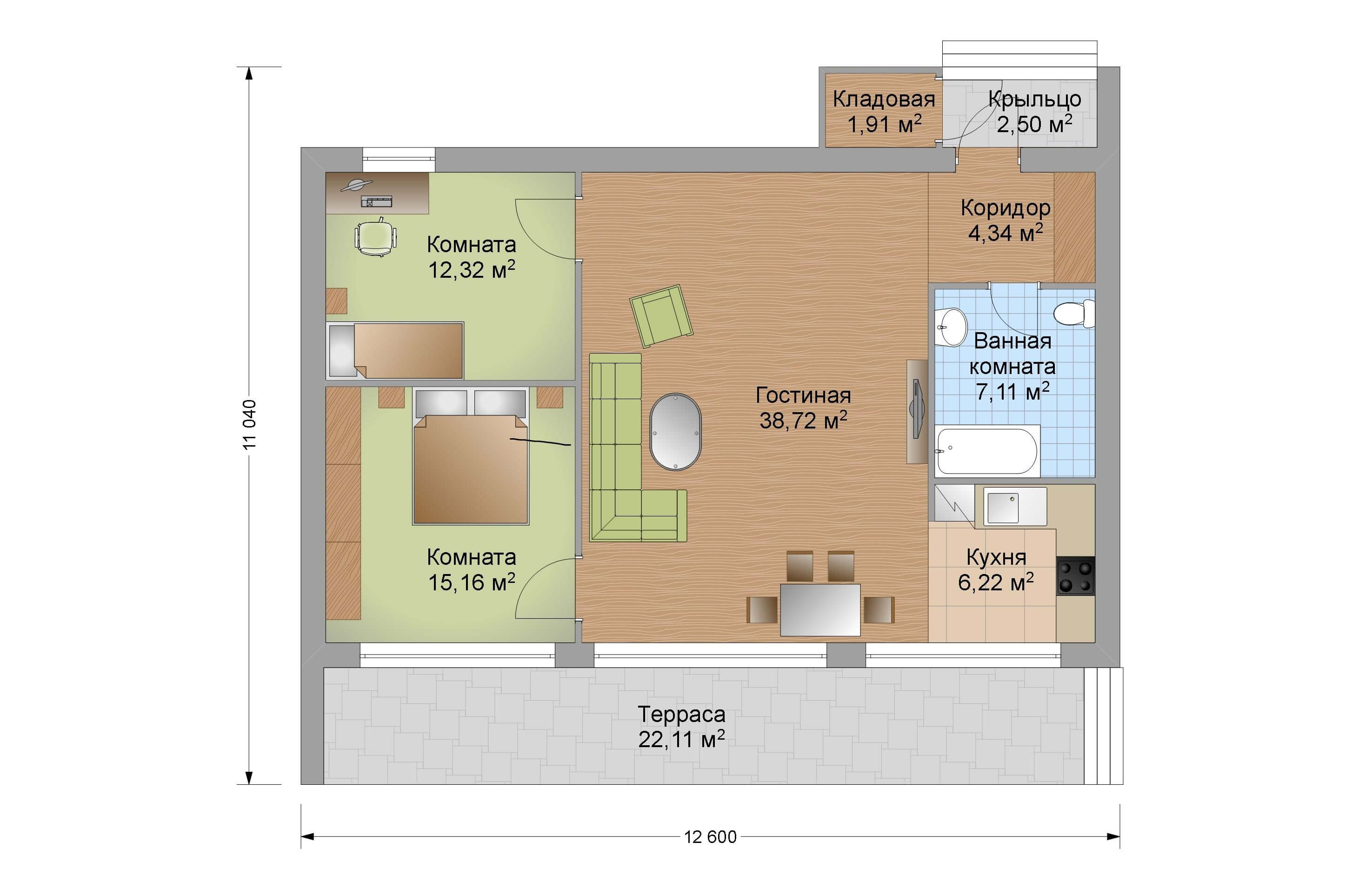 Открытая дневная зона (гостиная с выделенной столовой и кухней) с выходом на террасу. Слева — ночная зона с двумя спальнями, в одной из которых панорамное окно, которое так же предполагает возможность выхода на террасу.