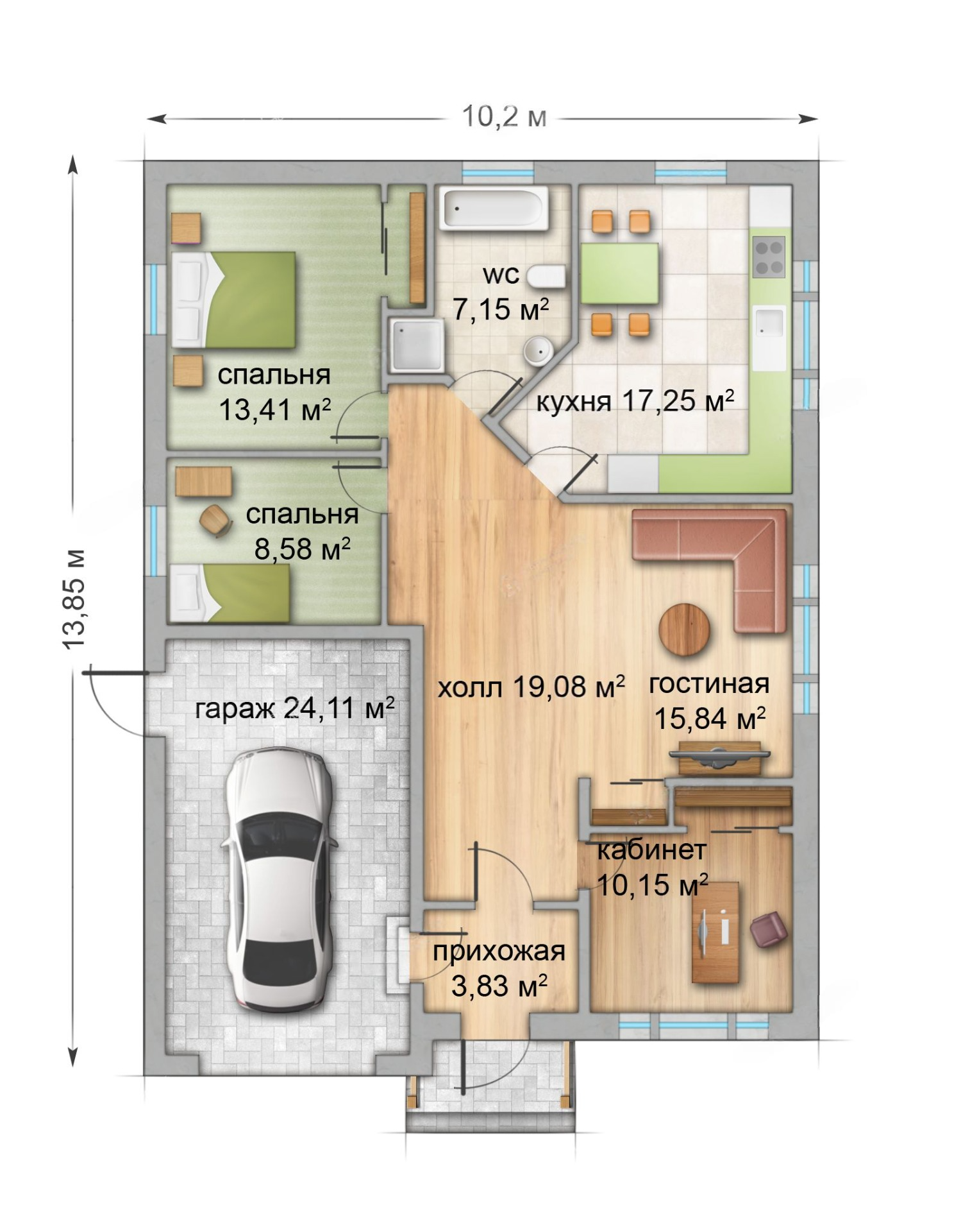 Из прихожей Вы можете зайти как в холл, так и в гараж. Гостиная располагается в центре дома. Она совмещена с холлом, что позволяет избежать ненужных коридоров и при этом создается ощущение большого пространства.