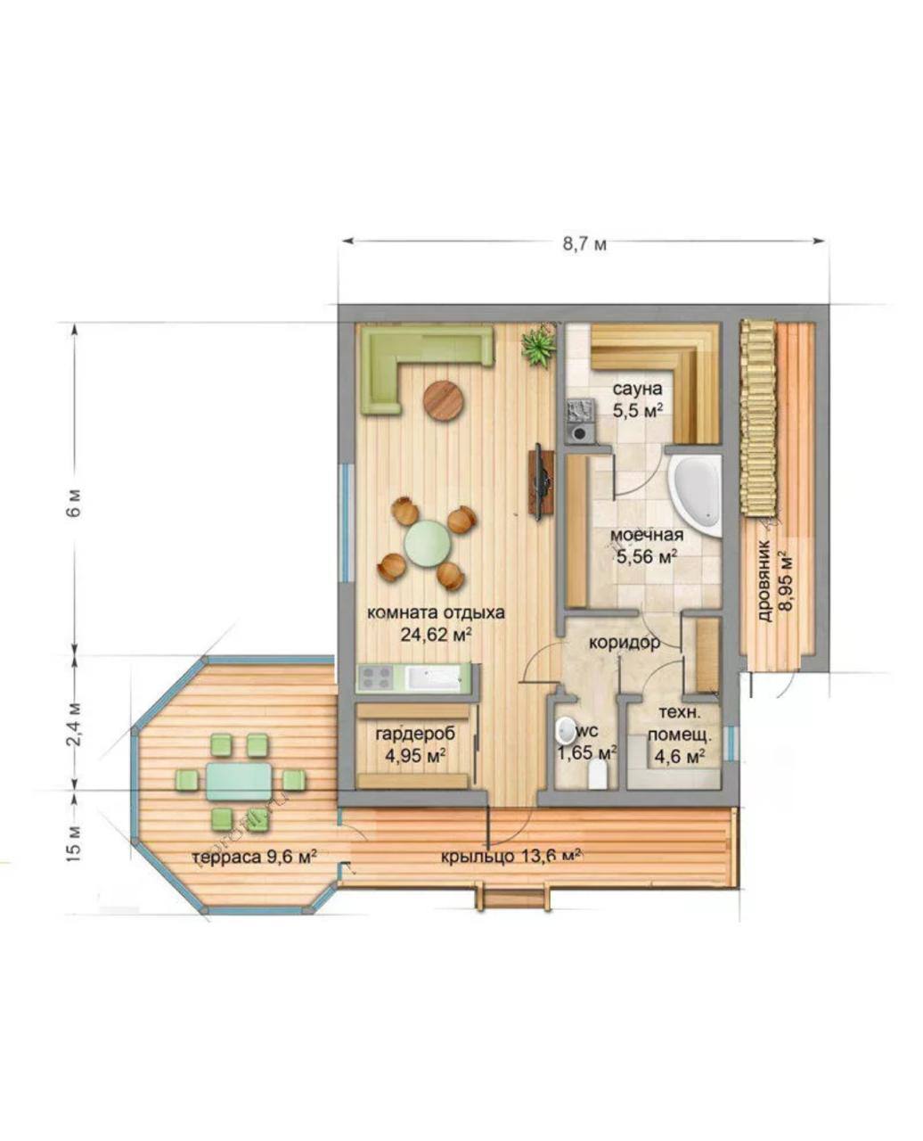 Баня с террасой – шикарное решение нескольких проблем. В этом проекте имеется все, что нужно для прекрасного отдыха.