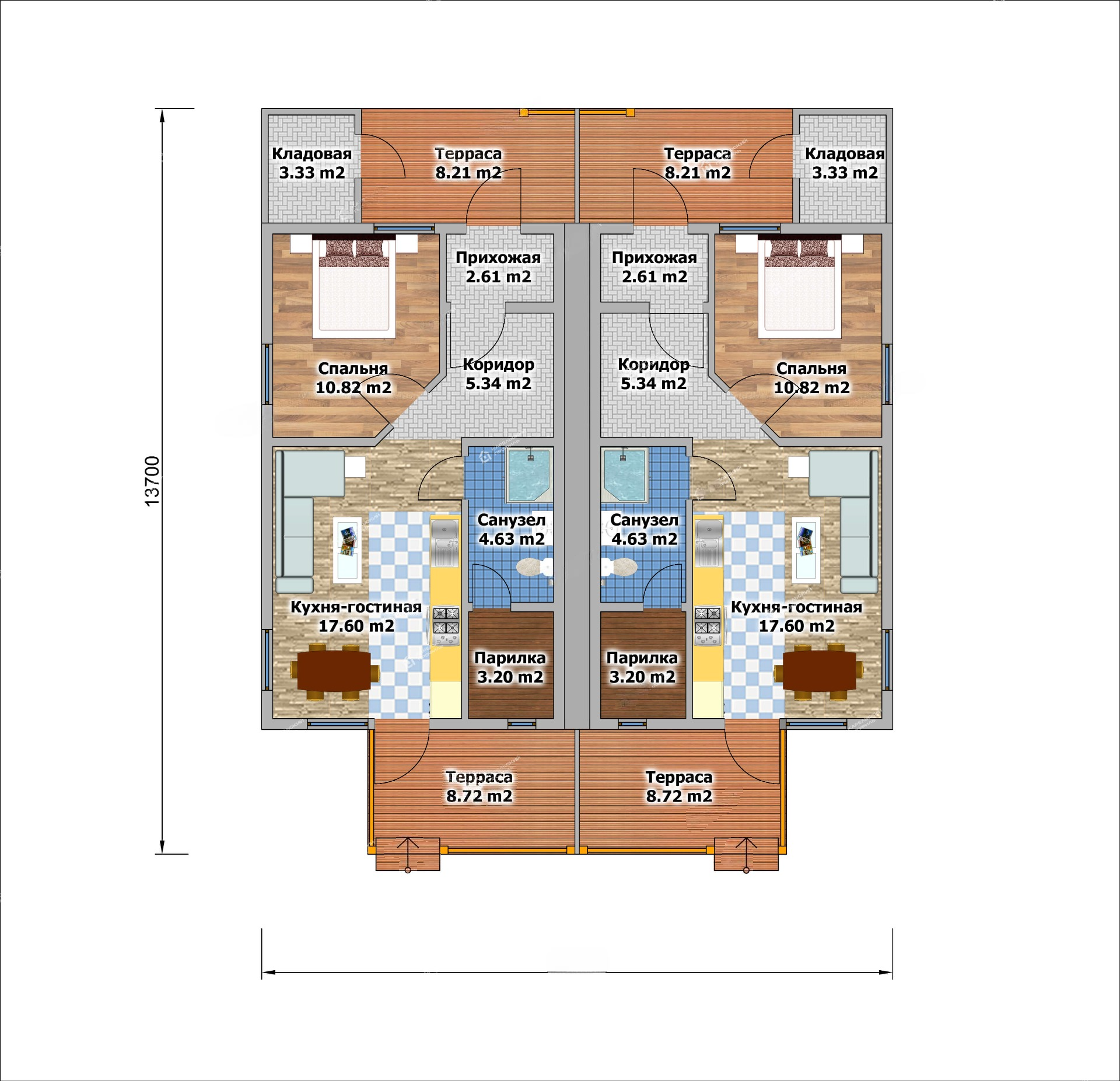 Такие проекты планируются таким образом, чтобы у каждой семьи был отдельный вход. Стоимость такого дома значительно ниже, чем при постройке отдельного дома для каждой семьи. Экономия получается за счет того, что квартиры имеют общую стену и расположены под одной кровлей.