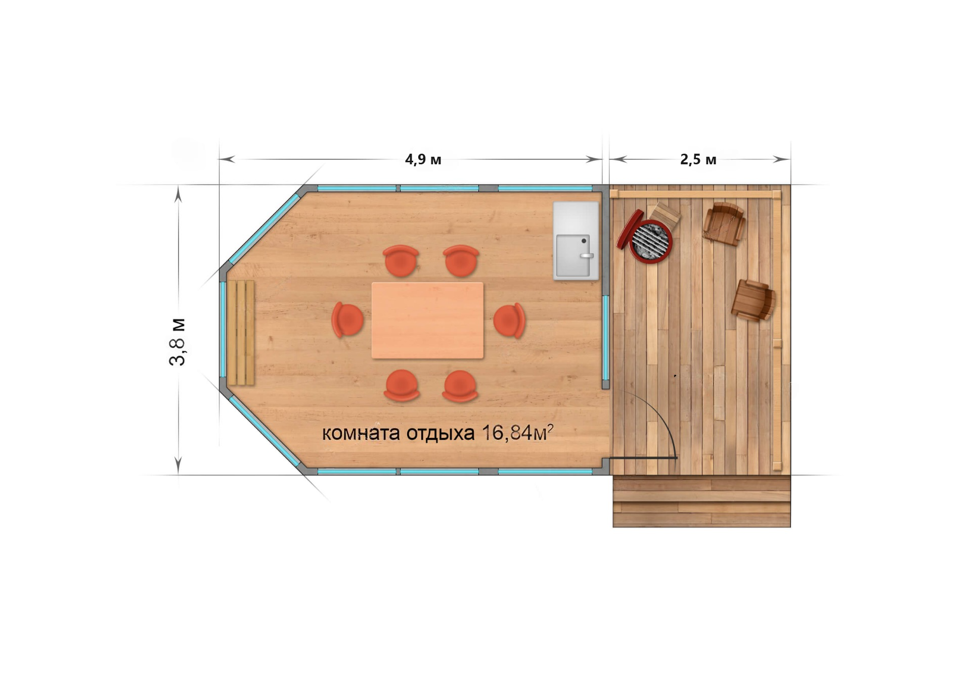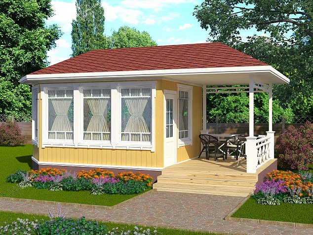 Этот проект концептуально объединяет в себе несколько возможностей, в зависимости от потребностей и ситуации. В нём можно реализовать: летнюю кухню, гриль домик - Grill house, финскую садовую беседку и садовый гостевой домик. Выбор концепции за Вами.