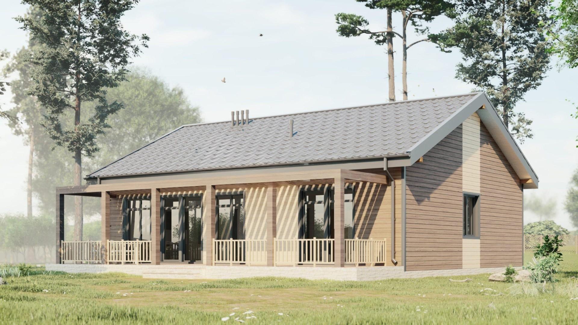 Планировка дома предполагает наличие трех спален, кухню - столовую, совмещенную общим пространством с зоной гостиной с наклонными потолками и имеющей выход на террасу, санузел, душевую, техническое помещение совмещенное с прачечной, а также тамбур, коридор и гардероб. Предусмотрено чердачное пространство.