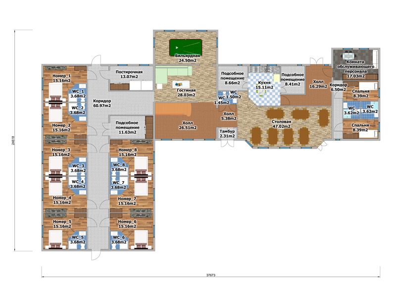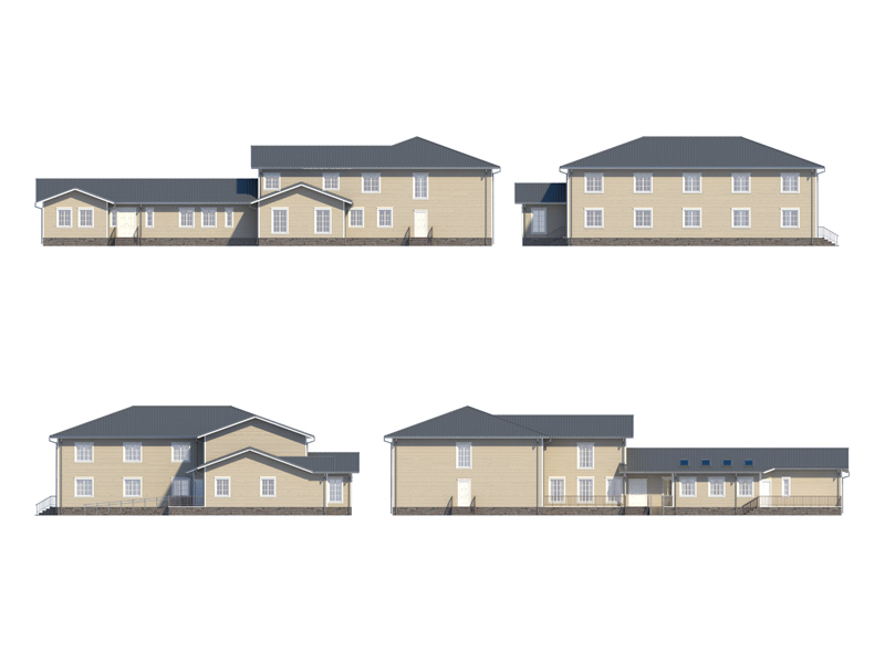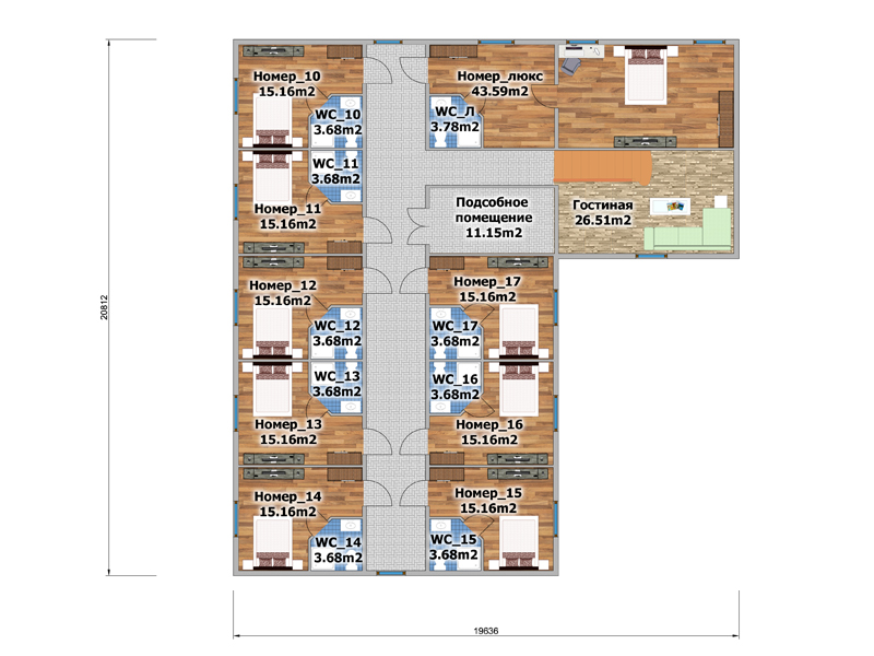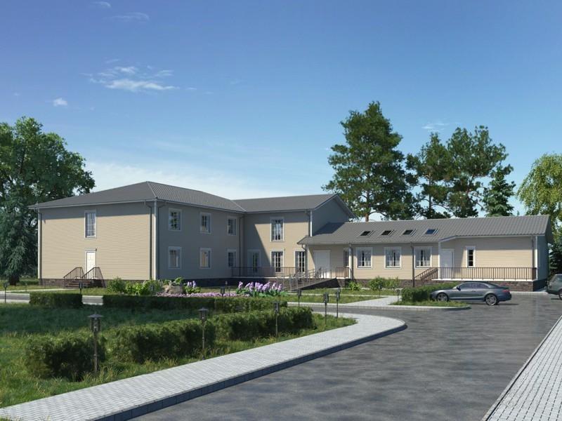 гостиница для тех территорий, где гостиницу удобней разместить вдоль границы участка, как придорожная гостиница, гостиница для базы отдыха или гостиница для детского лагеря.
