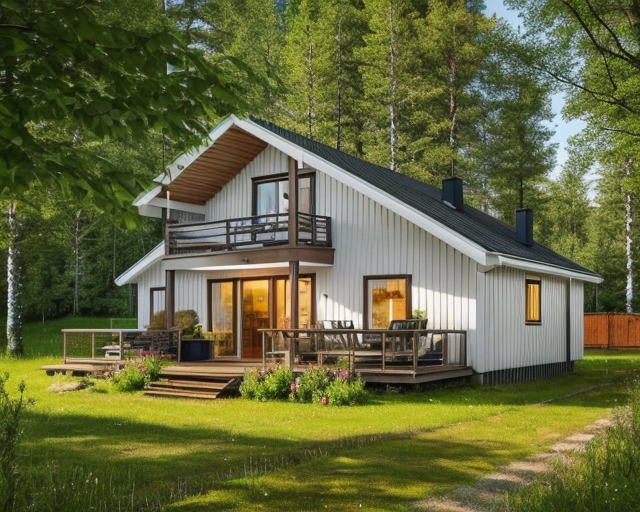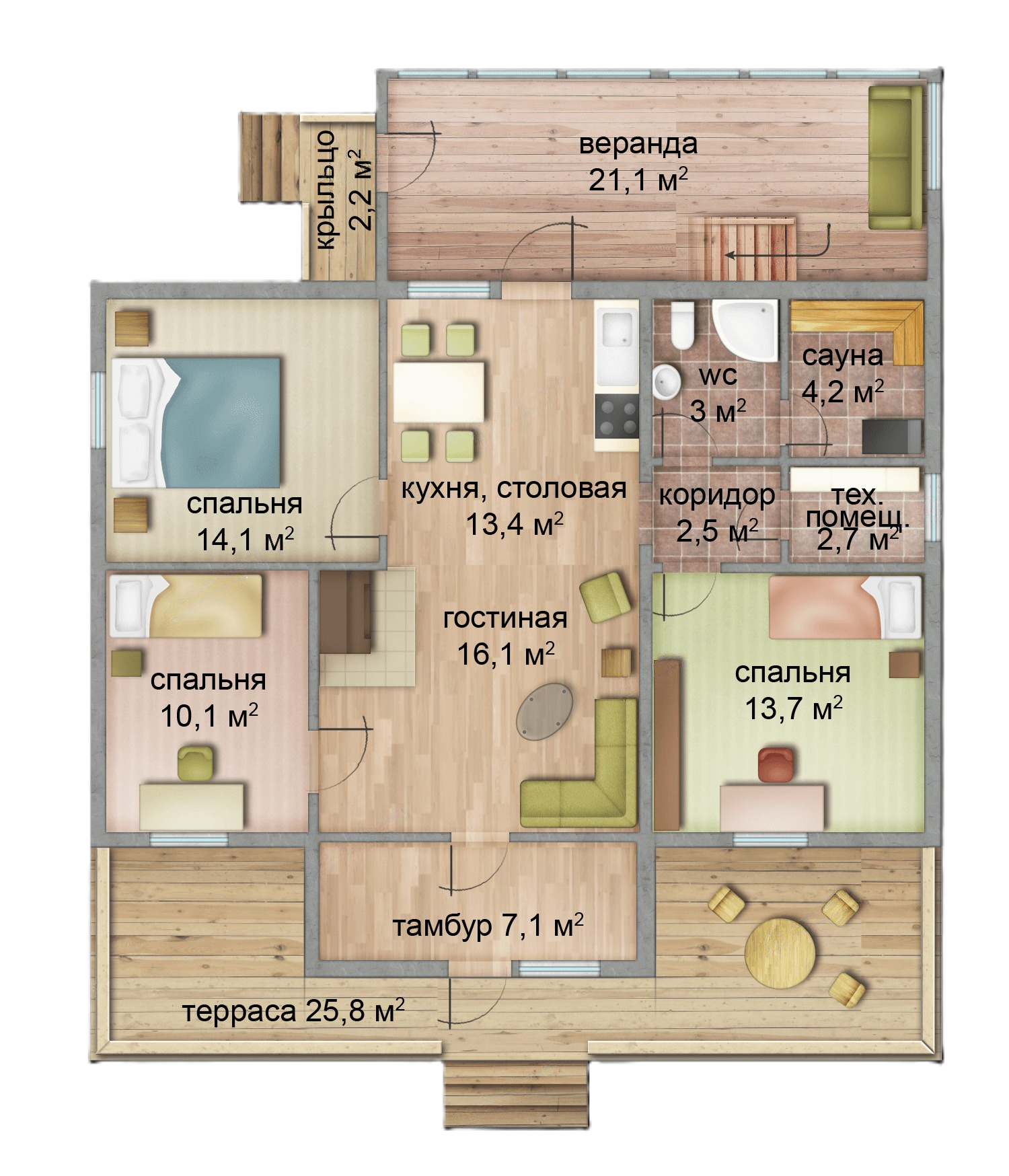 Планировка первого этажа предполагает кухню - столовую 13.4 м² с выходом на веранду 21.1 м² и объединенную общей площадью с гостиной 16.1 м², также имеющей выход на террасу 25.8 м² через тамбур 7.1 м² , три спальных комнаты: 14.1 м², две из которых - 10.1 м² и 13.7 м² - имеют выход на террасу, санузел 3 м², техническое помещение 2.7 м², коридор 2.5 м² и сауну 4.2 м².