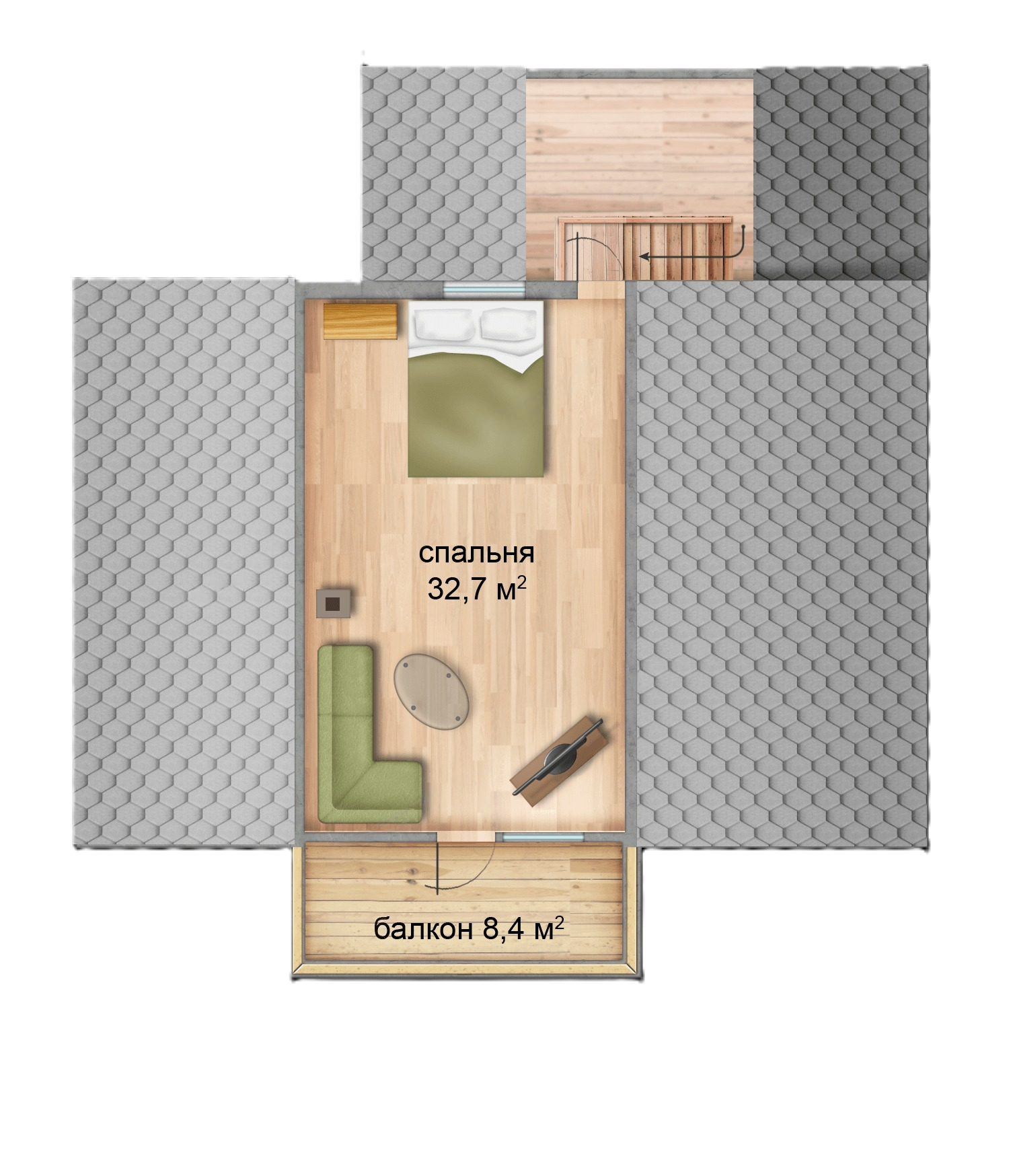 Второй - мансардный этаж - представлен одной большой спальной комнатой 32.7 м² с выходом на балкон 8.4 м².
