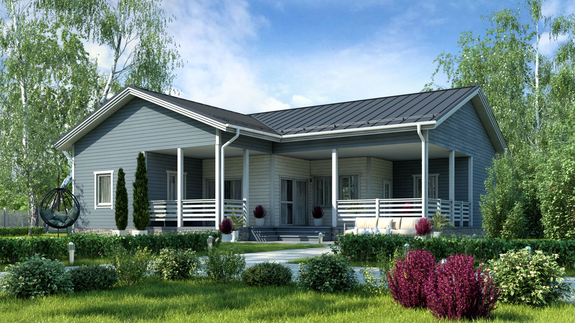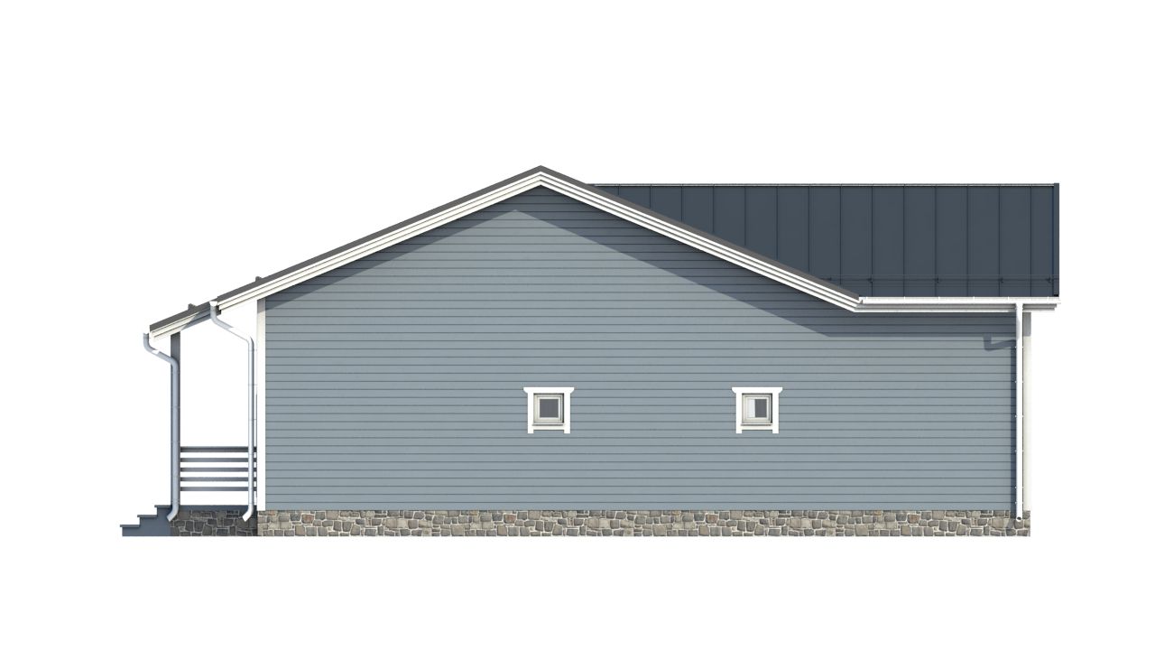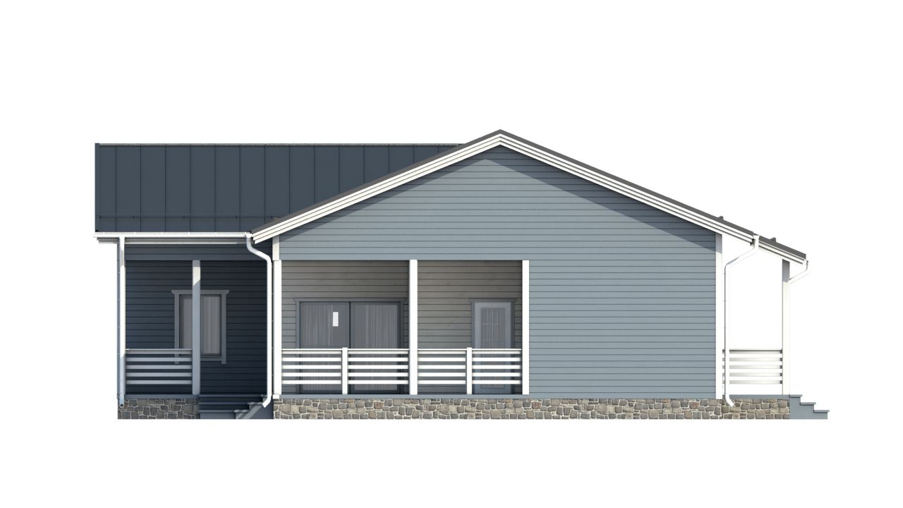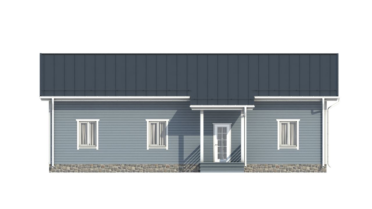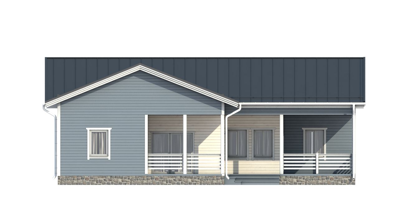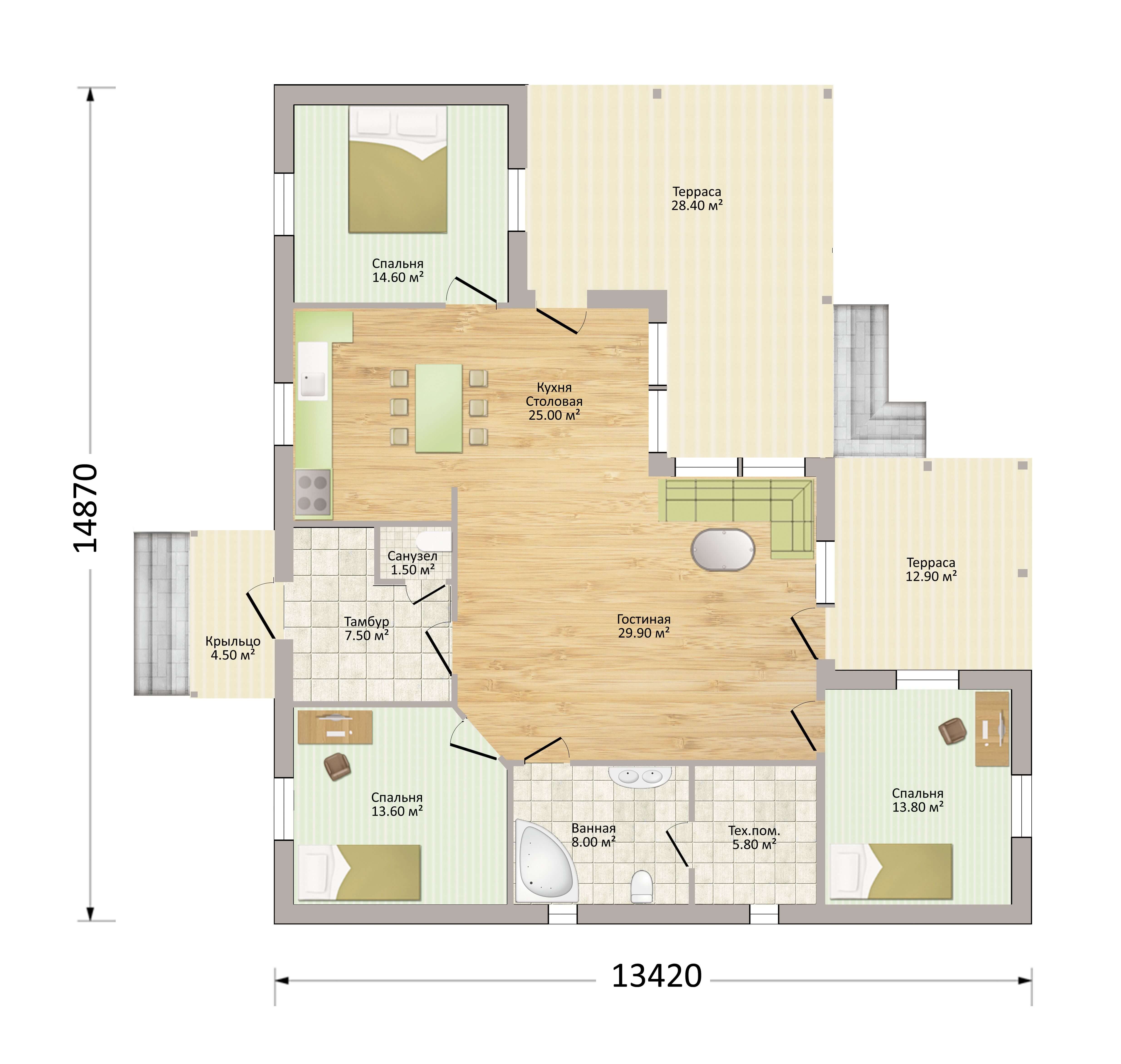 На первом этаже дома расположены: большая кухня - столовая 25.00 м² с выходом на просторную террасу 28.40 м² и объединенную общей площадью с гостиной 29.90 м², имеющую выход на вторую террасу 12.90 м², три спальни: 13.60 м², 13.80 м² и 14.60 м², ванная комната 8.0 м², техническое помещение 5.80 м², санузел 1.50 м², а также тамбур 7.50 м² с выходом на крыльцо 4.50 м².