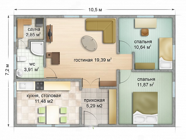 Проектом предусмотрены: гостиная площадью 19.39 м², кухня-столовая 11.48 м², санузел 3.91 м², две спальных комнаты 10.64 м² и 11.87 м², прихожая 5.29 м².