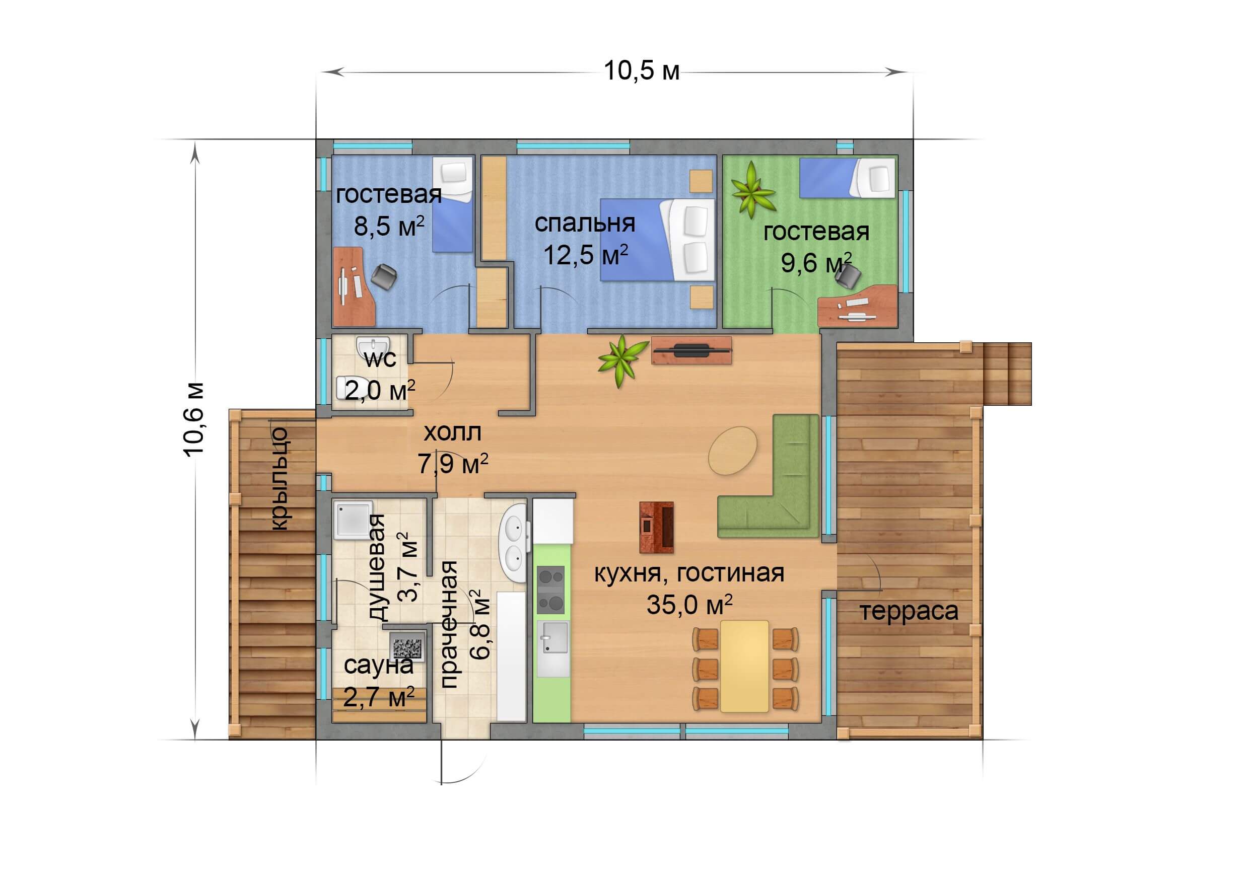 Каркасный дом Керке выполнен в современном стиле «HiTech». Данный проект сочетает в себе простоту архитектурных форм и высокую функциональность. Планировка внутренних помещений создает комфортное проживание семьи до 4-х человек. Имеется просторная гостиная, объединенная с кухней, 3 спальных комнаты, санузел, хозблок. Также по примеру наших финских соседей в доме предусмотрена сауна и просторная терраса. Гибкость технологии завода «Дома Карелииь» позволяет учесть все пожелания будущих жителей дома и внести изменения в планировку в случаи необходимости. Внешний облик дома гармонично впишется в городской пейзаж или будет выделяться своей индивидуальностью среди загородных строений. Каркасный дом Керке - дом для людей, которые ценят комфорт, экологичность и идут в ногу со временем.