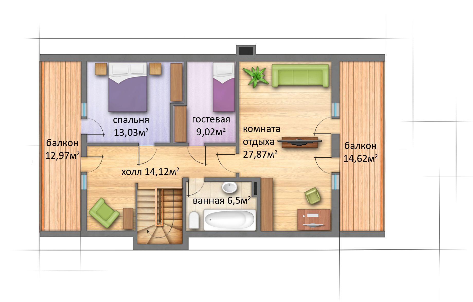 Второй этаж представлен спальной комнатой 13.03 м² с выходом на балкон 12.97 м², гостевой 9.02 м², ванной комнатой 6.5 м² и объемной комнатой отдыха 27.87 м² с выходом на второй балкон 14.62 м², а также лестничным холлом 14.12 м².