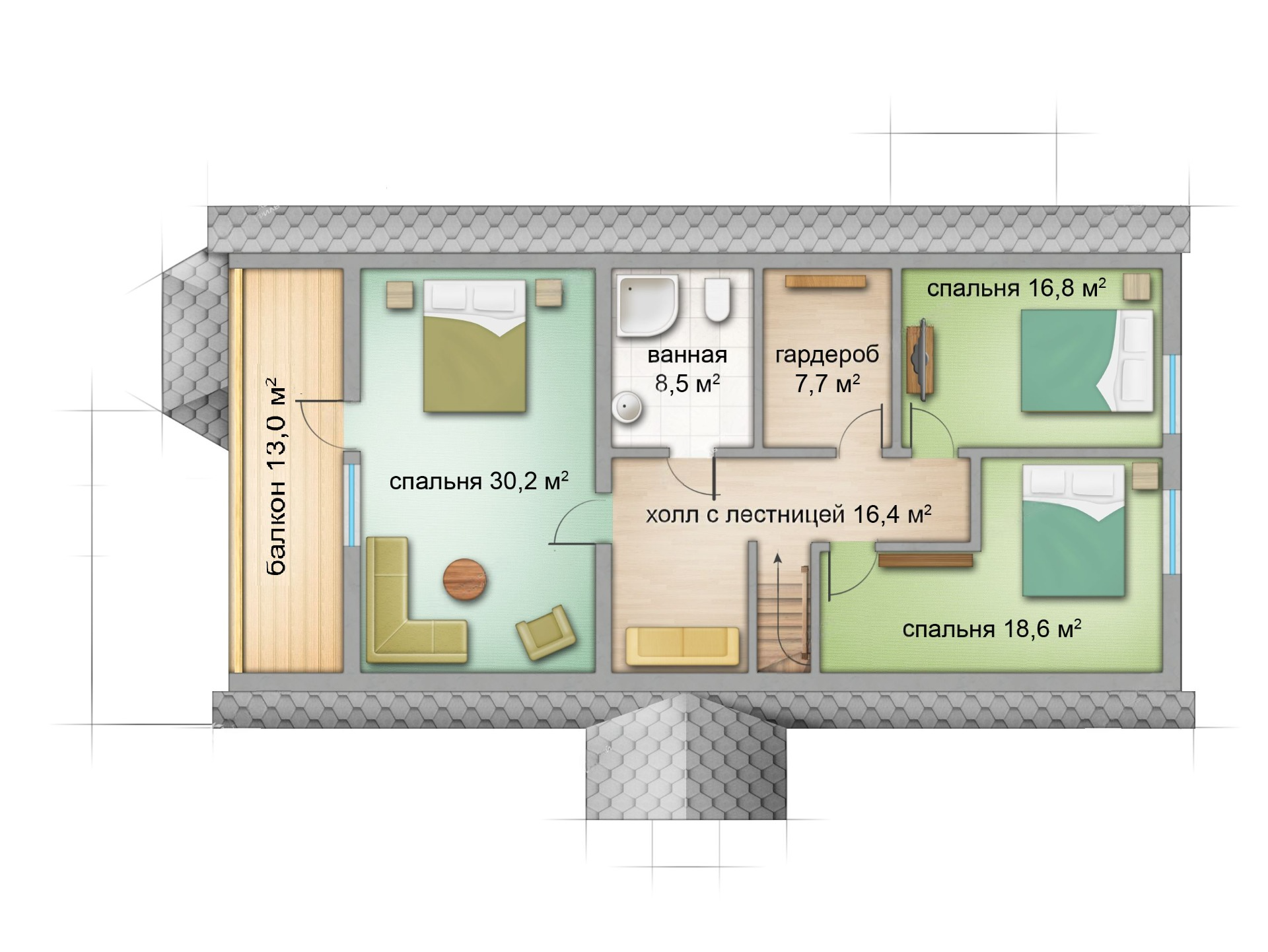 Второй этаж представлен тремя спальными комнатами: 16.8 м², 18.6 м², 30.2 м² с выходом на балкон 13.0 м², ванной комнатой 8.5 м² и гардеробом 7.7 м², а также лестничным холлом 16.4м².
