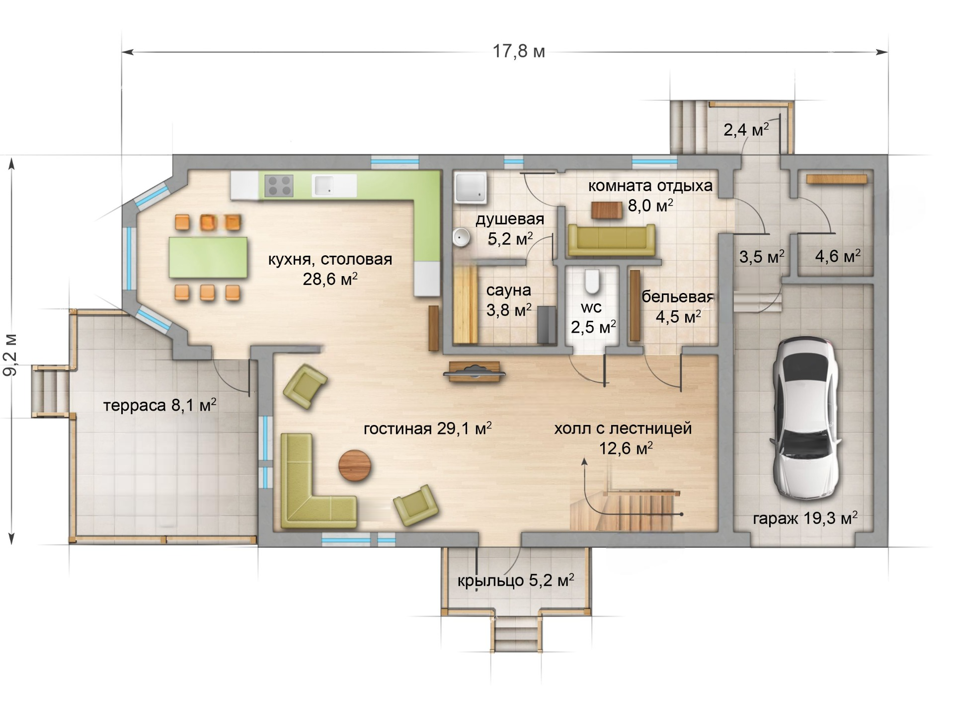 Планировка первого этажа представлена просторной кухней - столовой 28.6 м², имеющей выход на террасу площадью 8.1 м², объединенной общей площадью с гостиной 29.1 м², комнатой отдыха 8.0 м², бельевой 4.5 м², душевой 5.2 м², сауной 3.8 м² и санузлом 2.5 м², лестничным холлом 12.6 м².