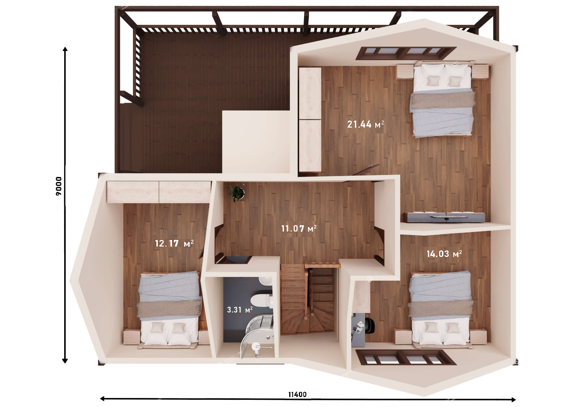 На первом этаже находятся кабинет, кухня-гостиная, прихожая, спальня, коридор и санузел. На втором – коридор, санузел и три спальни, которые также могут использоваться как гостиные или иметь другое предназначение.