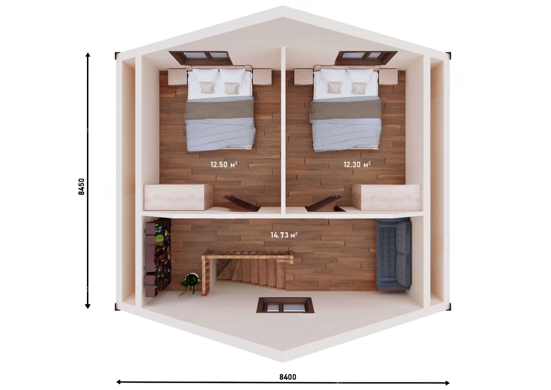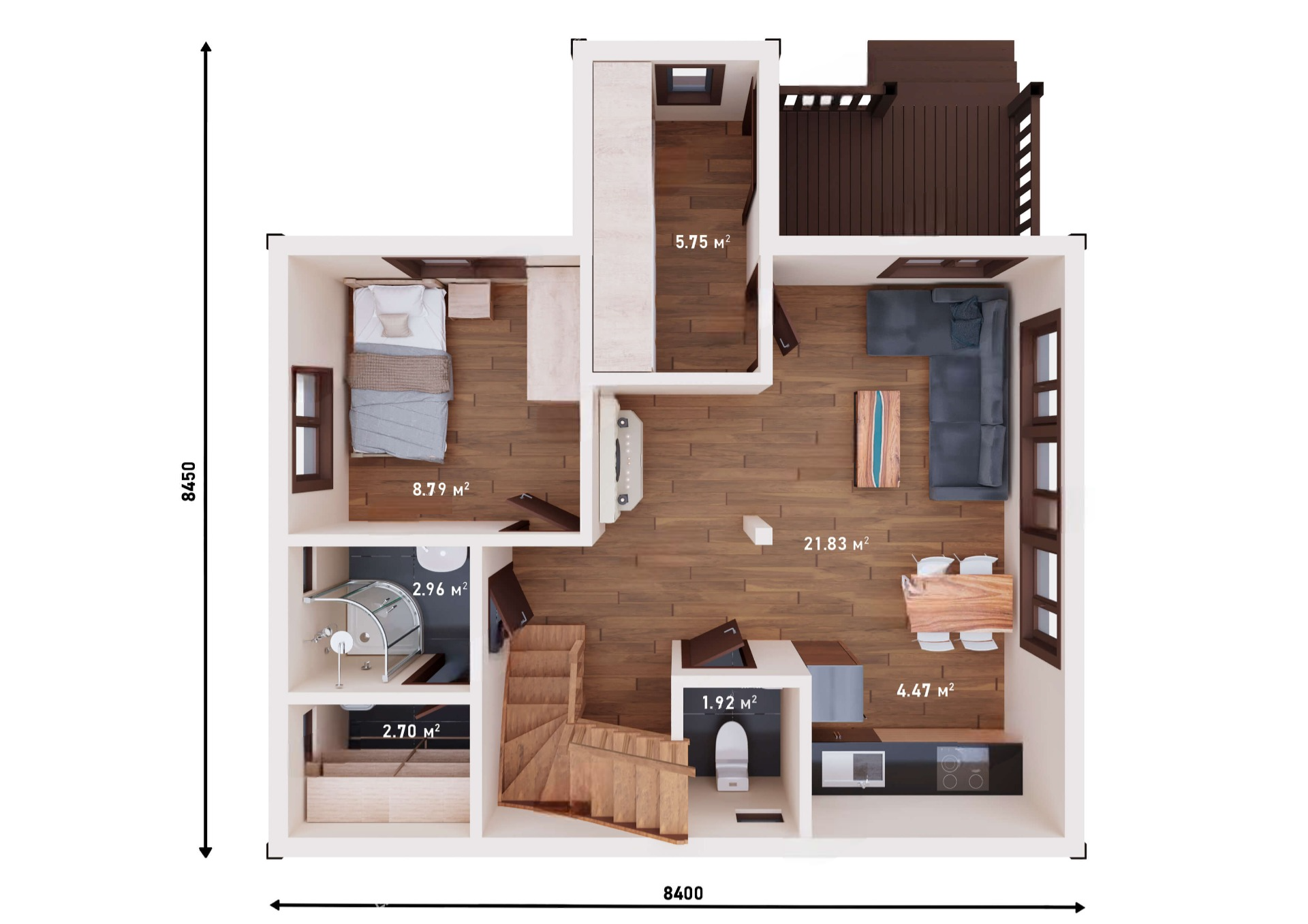 Планировка первого этажа предполагает: кухню в 4,47 м², объединенную общей площадью со столовой в 21.83 м², спальню 8.79 м², санузел 2.96 м², хозблок 2.70 м² и тамбур 5.75 м². Зона мансарды представлена двумя спальнями 8.96 м² и 8.99 м², холлом с лестницей в 12.85 м².