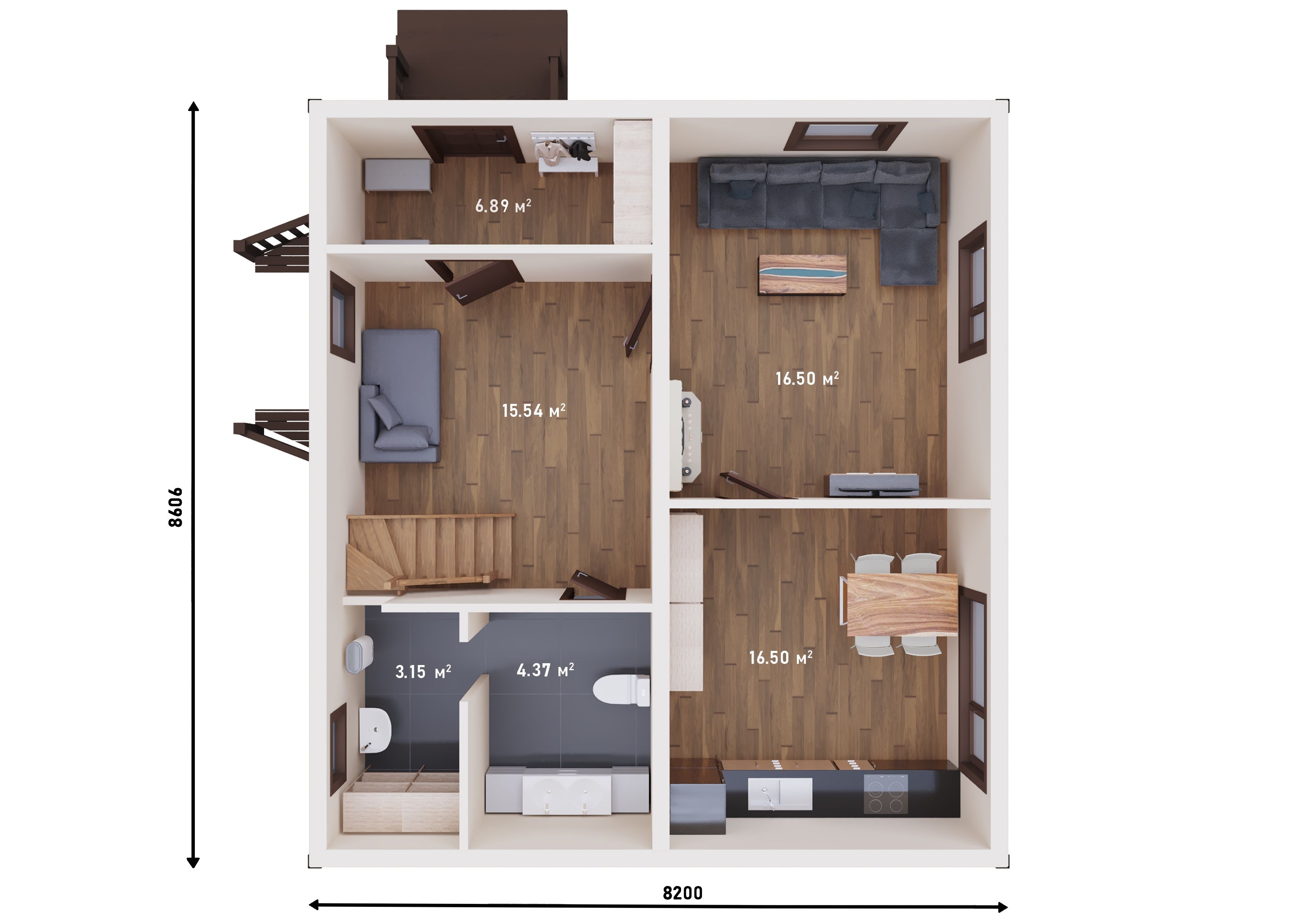Лестничный холл площадью 15.54 м² и тамбур площадью 6.89 м² создадут приветствующую атмосферу при входе в дом и обеспечат удобство передвижения между этажами.