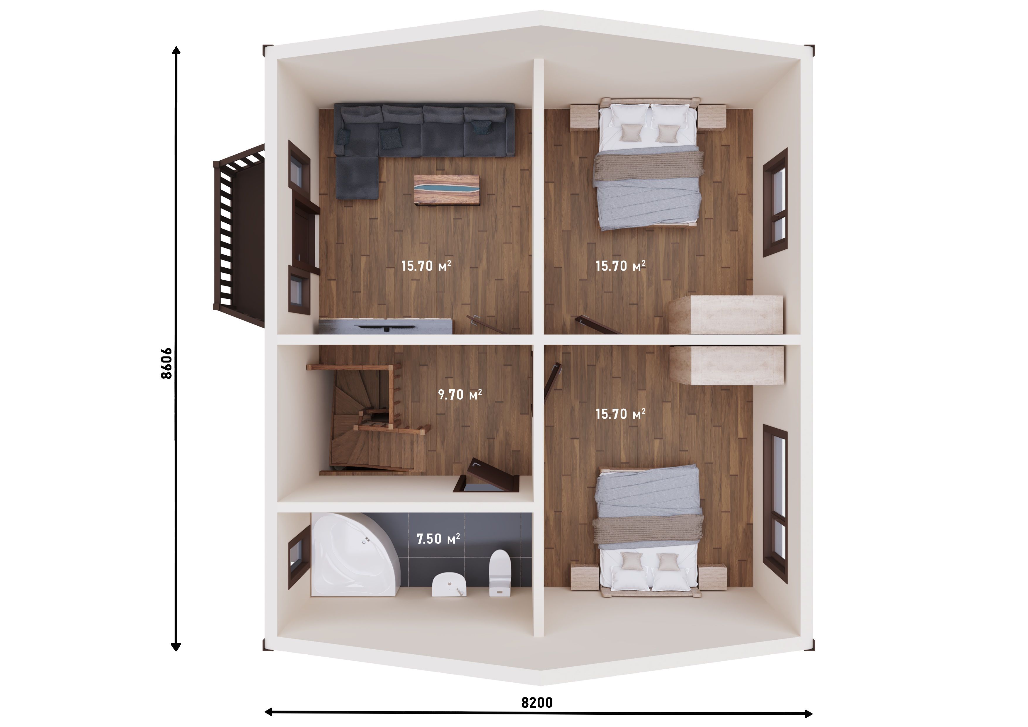 На втором этаже расположены три спальные комнаты площадью по 15.7 м² каждая, где вы сможете создать уютные и комфортные спальные зоны. Ванная комната площадью 7.5 м² обеспечит условия для гигиены и расслабления. Лестничный холл площадью 9.7 м² обеспечит удобство передвижения между этажами.