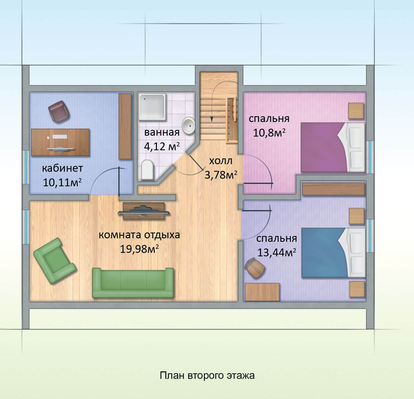Второй этаж представлен двумя спальнями - 10.8 м² и 13.44 м², кабинетом 10.11 м², ванной 4.12 м² и комнатой отдыха 19.98 м², объединенной общим пространством с лестничным холлом 3.78 м².
