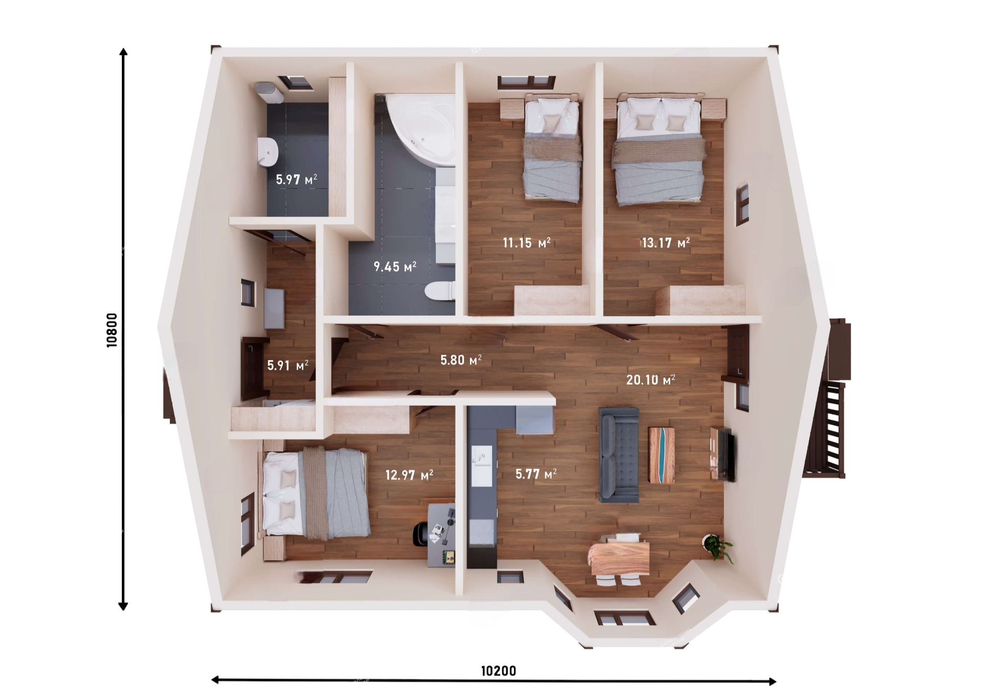 Проектом предложены: гостиная в 20.10 м², объединенная общим пространством с кухней в 5.77 м², три спальни площадью 13.17 м², 11.15 м² и 12.97 м², ванная комната 9.45 м², тамбур 5.91 м², а также техническое помещение 5.97 м².