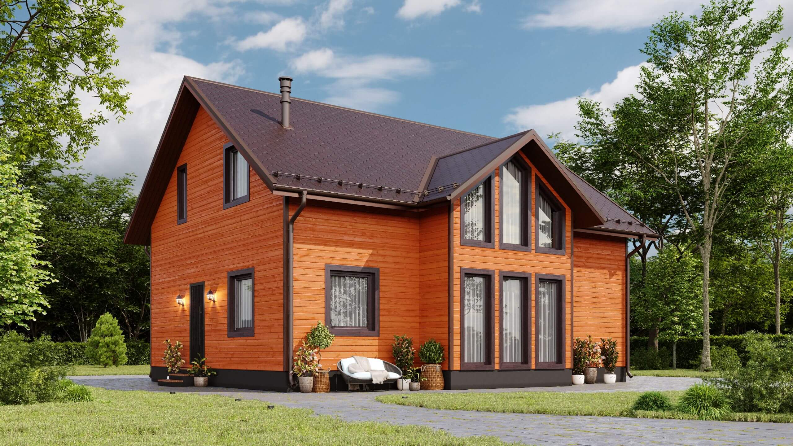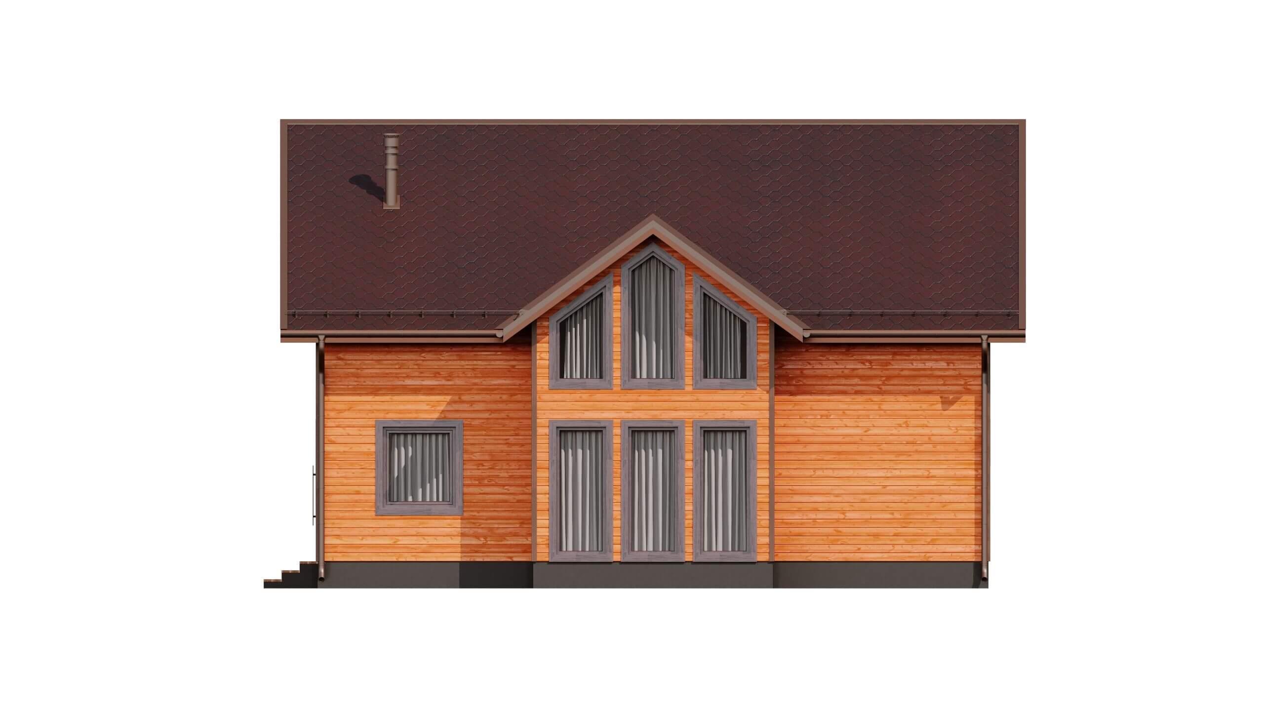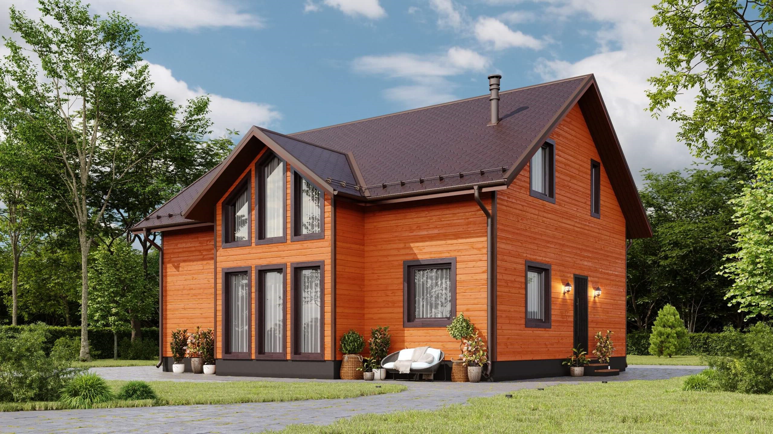 Фасад дома украшен большими окнами гостиной со вторым светом. Грамотный выбор отделочных материалов придаст Вашему дому индивидуальный, богатый вид.