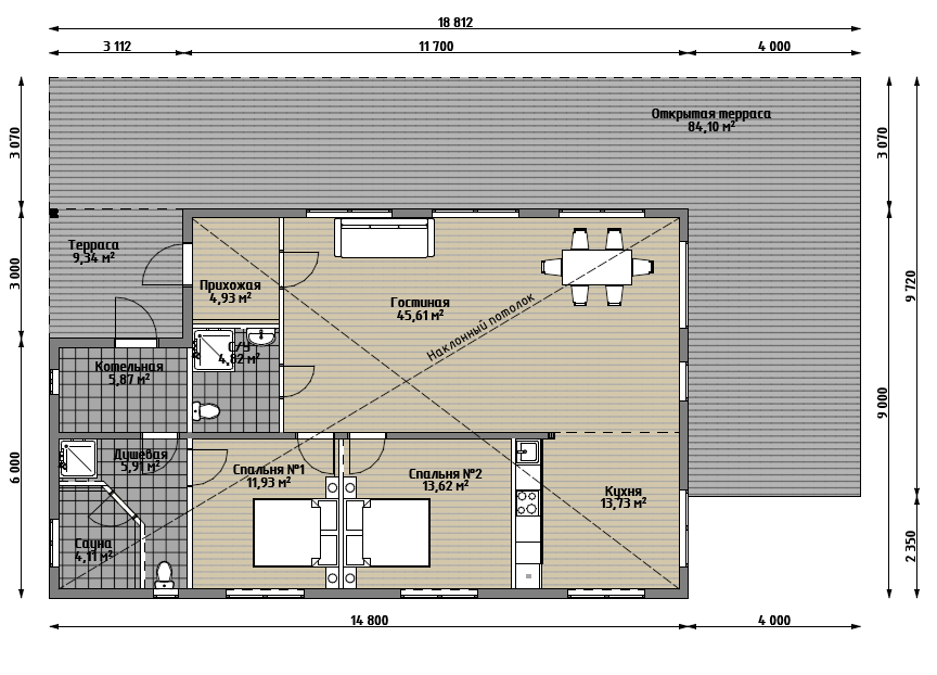 Проект сочетает в себе простоту архитектурных форм и высокую функциональность. Планировка внутренних помещений создает комфортное проживание семьи до 4-х человек. Имеется просторная гостиная, объединенная с кухней, 2 спальных комнаты, санузел, хозблок. Также по примеру наших финских соседей в доме предусмотрена большая сауна и просторная терраса.