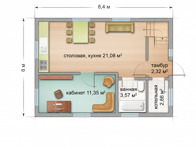 На первом этаже расположена просторная кухня-столовая площадью в 21.08 м² , а также кабинет 11.35 м², ванная комната, техническое помещение и тамбур.