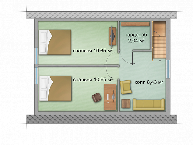Мансардный этаж имеет площадь более 30 м², где расположены две спальни, холл и гардеробная комната.