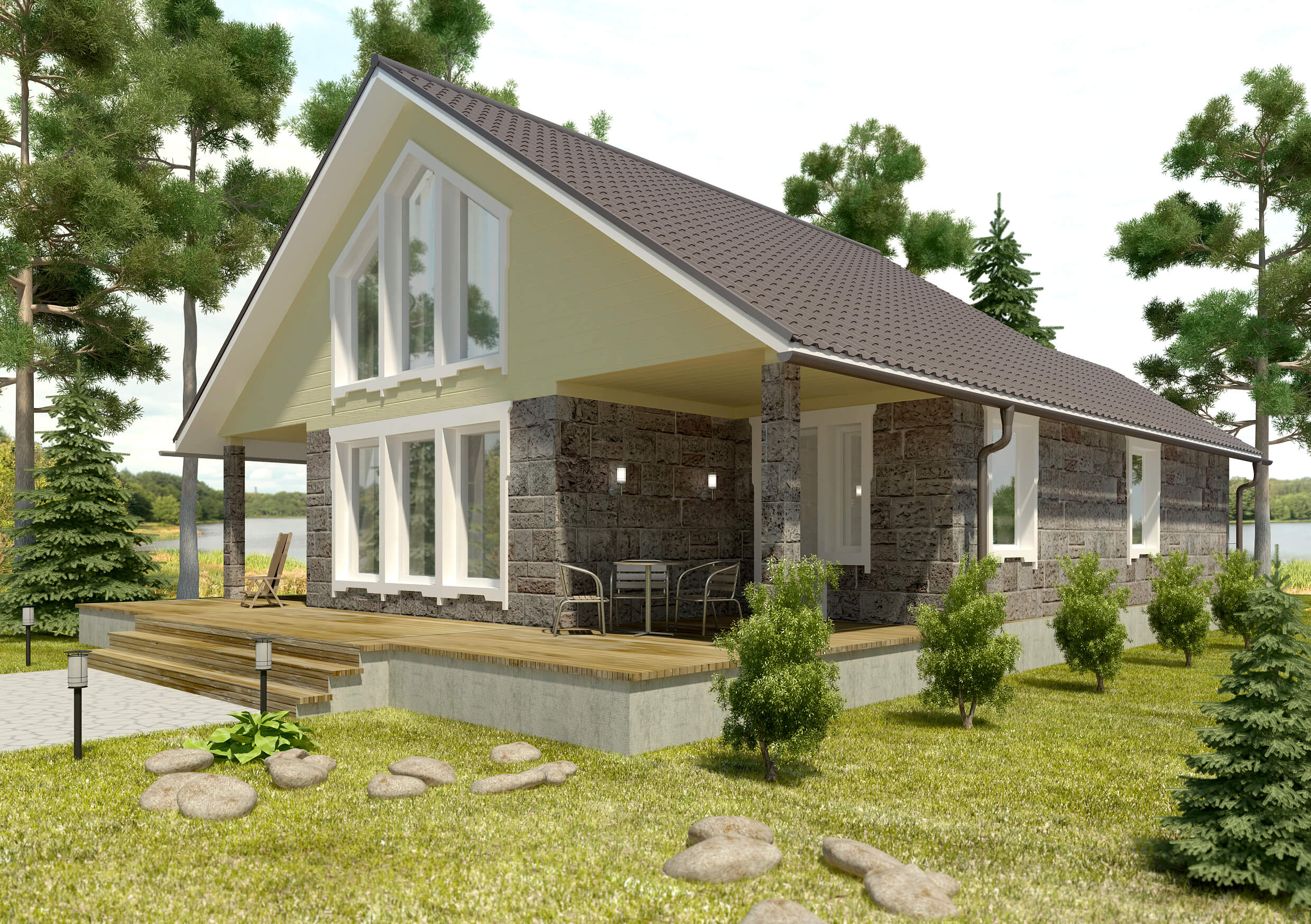 Планировка первого этажа дома представлена кухней 9.16 м² с выходом на одну из веранд площадью 14 м², объединенную с гостиной 26.33 м² с видом на террасу 9.7 м² и выходом в комнату отдыха 8.23 м². Комната отдыха имеет выход на вторую веранду 14 м² и в душевую 6.07 м², ведущую в сауну 5.96 м². На первом этаже также предложены проектом две спальни площадью 12.37 м² и 13.79 м², санузел 2.06 м² и входная группа общей площадью 9.19 м² с выходом на крыльцо 6.37 м². С крыльца предполагается автономный вход в дополнительное техническое помещение дома 6.42 м².