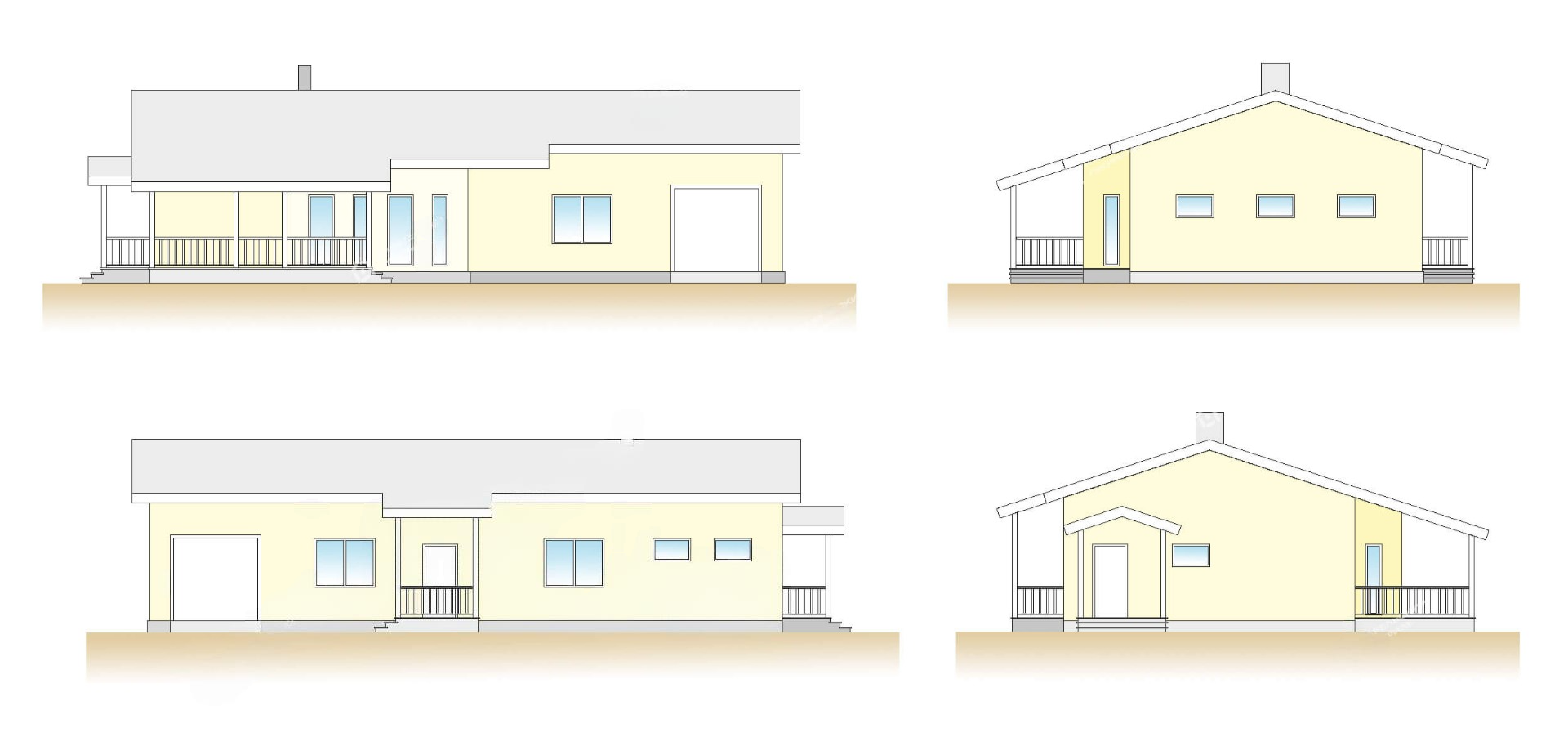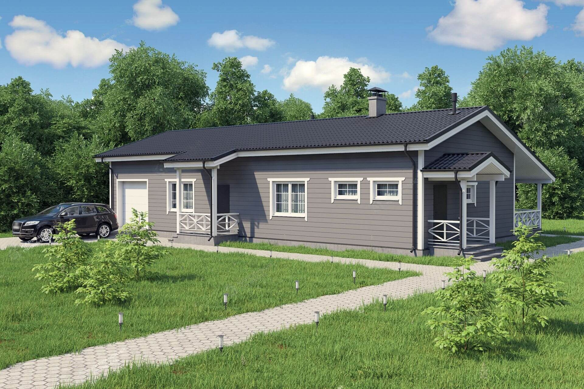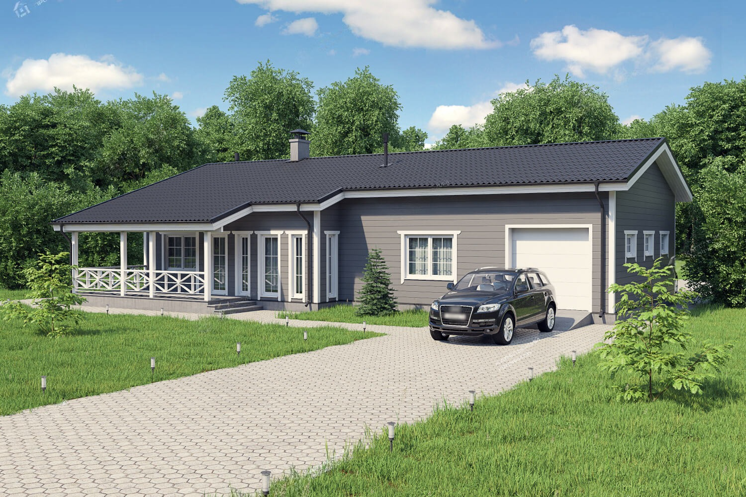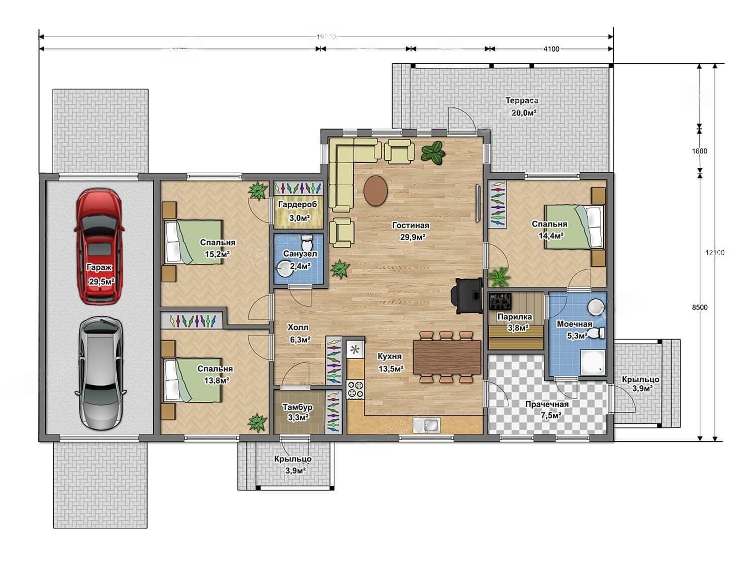 На первом этаже дома расположены: кухня 13.5 м², объединенная общей площадью с просторной гостиной 29.9 м², три спальных комнаты: 15.2 м² с выходом в гардероб 3.0 м², 13.8 м² и 14.4 м² с выходом на террасу 20.0 м², санузел 2.4 м², моечная комната 5.3 м², прачечная 7.5 м² с выходом на второе крыльцо 3.9 м², сауна 3.8 м², а также входная группа, представленная холлом 6.3 м² и тамбуром 3.3 м² с выходом на главное крыльцо 3.9 м².