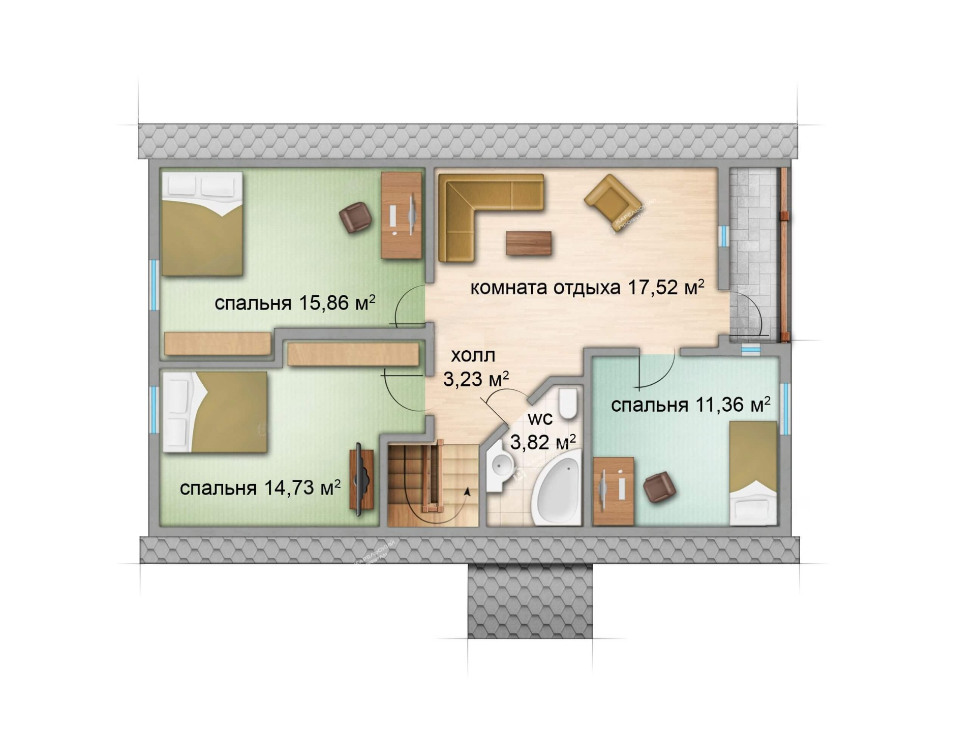 Второй этаж представлен тремя спальнями: 15.86 м², 14.73 м² и 11.36 м², санузлом 3.82 м², а также комнатой отдыха 17.52 м² с выходом на балкон и объединенной общим пространством с лестничным холлом 3.23 м².