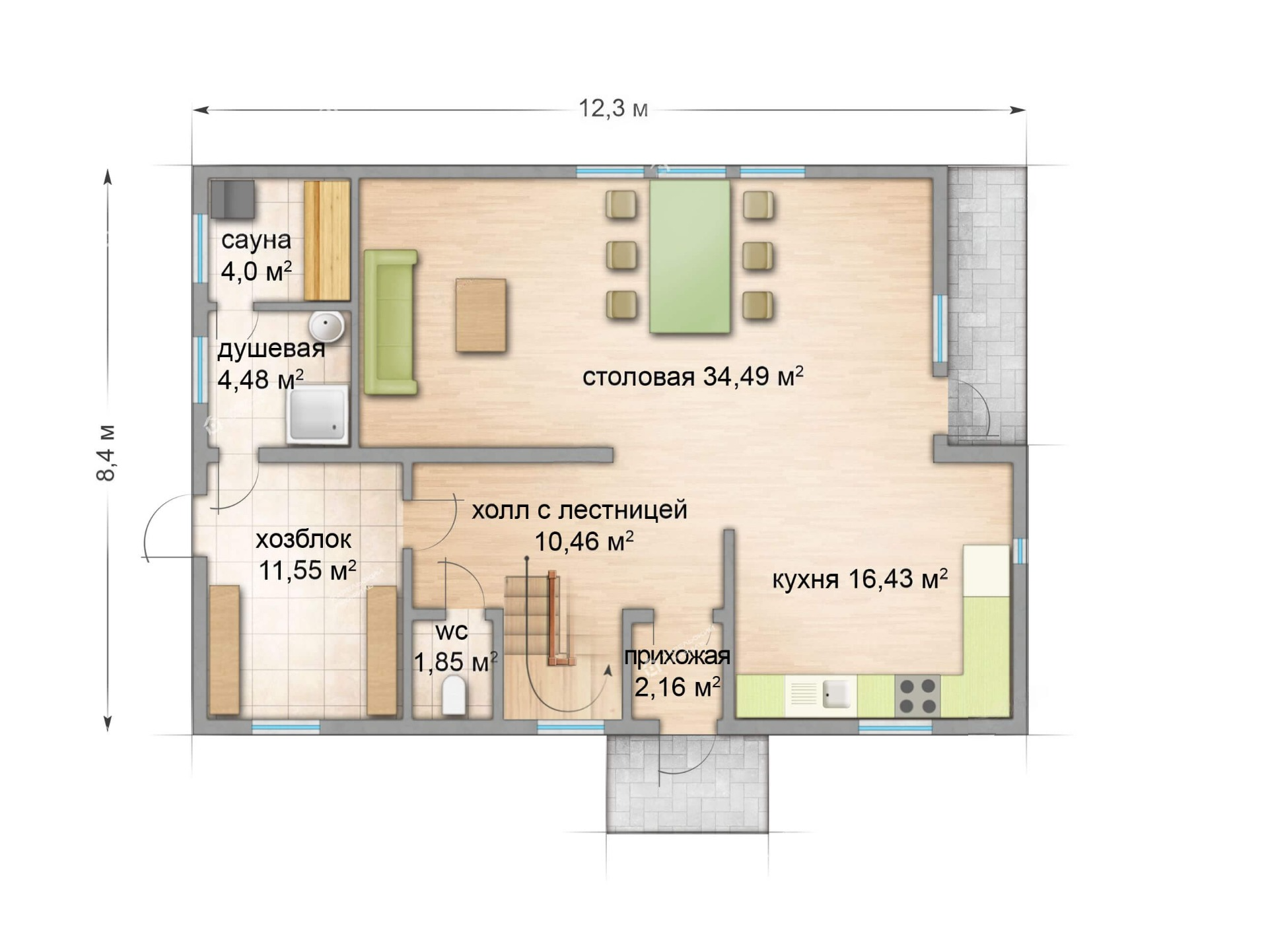 Планировка первого этажа дома представлена кухней 16.43 м², объединенной общей зоной со столовой 34.49 м², откуда предусмотрен выход на крыльцо, хозблоком 11.55 м², душевой 4.48 м² , санузлом 1.85 м² и сауной 4.0 м², а также прихожей 2.16 м² и лестничным холлом 10.46 м².