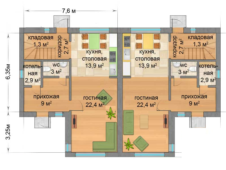 Еще одна не маловажная характеристика дома на две семьи Дуплекс 3 – это его не большие габариты 16 х 9 м, такой дом Вы сможете расположить даже на небольшом участке.