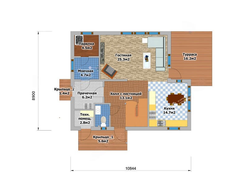 На первом этаже дома расположены: кухня 14.7 м², объединенная общей площадью с гостиной 25.3 м², имеющей выход на террасу 16.2 м², санузел, моечная комната 4.7 м², техническое помещение 2.8 м², прачечная 6.2 м² с выходом на второе крыльцо 1.50 м², сауна 4.5 м², а также лестничный холл 13.1 м² с выходом на парадное крыльцо 5.6 м².