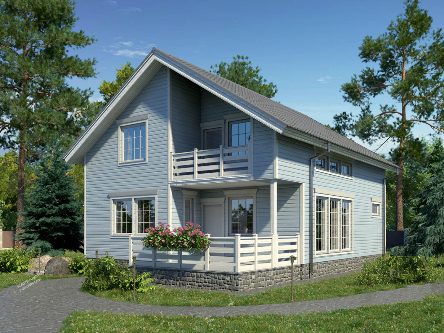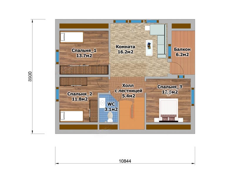Второй этаж представлен тремя спальными комнатами: 13.7м², 11.8 м², 12.5 м², большой гостевой комнатой 16.2 м² с выходом на балкон 6.2 м², санузлом 3.1 м², а также лестничным холлом 5.4 м².