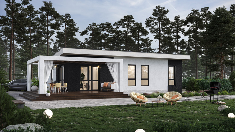 Представляем Вашему вниманию новый проект 2022г. Соответствует всем современным тенденциям, просторные помещения, панорамные окна, открытая терраса. В доме две спальни, два санузла и вместительная гардеробная комната.
