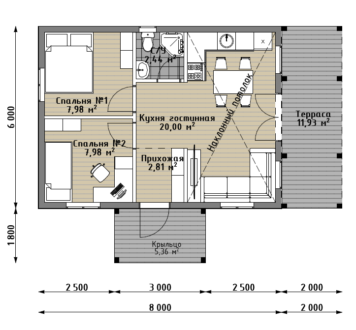 Особое внимание уделено наличию террасы, которая защищает от солнца или дождя. Площадь террасы позволяет разместить стол и стулья, чтобы проводить больше времени на свежем воздухе, что особенно важно для городских жителей.