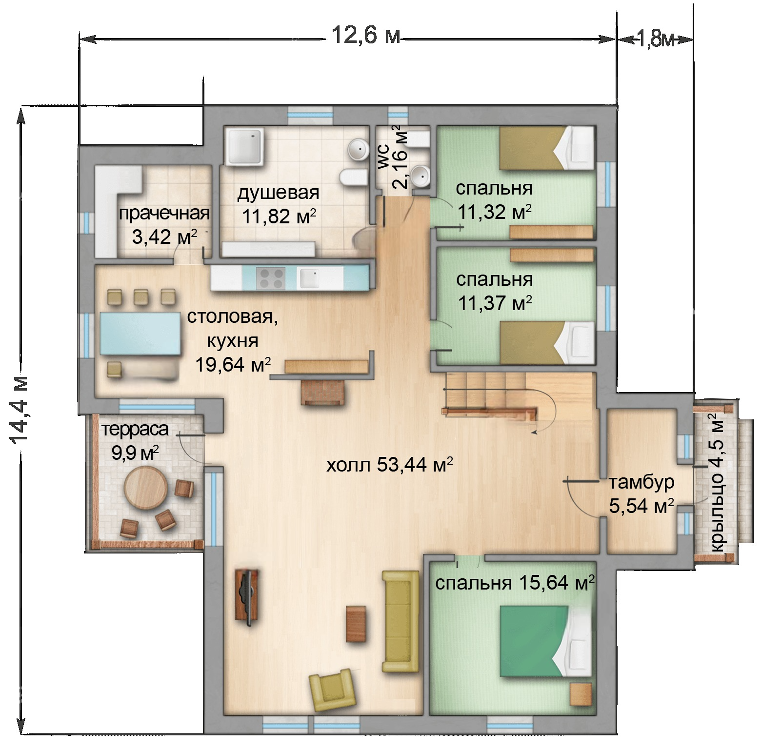 Планировка дома тщательно продумана и включает все для комфортной жизни семьи из 4-5 человек. Общая площадь дома 178м2. На первом этаже располагается просторный холл, гостиная, кухня, три спальни, санузел и подсобные помещения.
