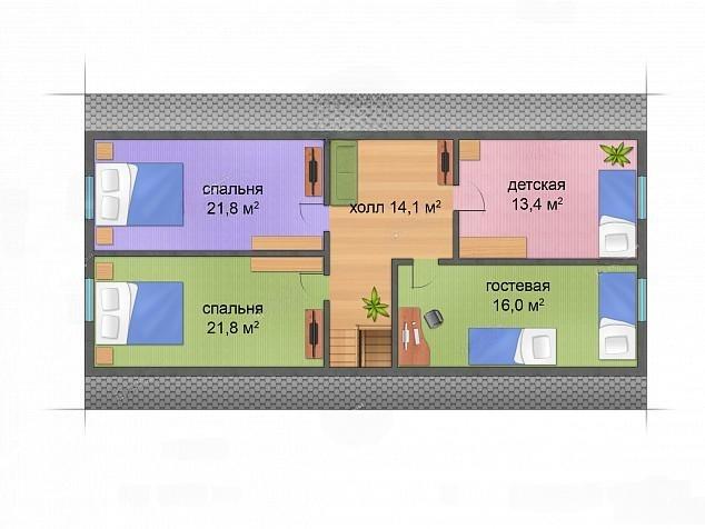 Второй представлен четырьмя спальными комнатами: 13.4 м², 16.0 м² и двумя по 21.8 м², а также лестничным холлом 14.1 м².