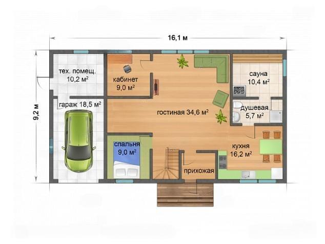 Планировка первого этажа предполагает кухню 16.2 м², объединенную общей площадью с гостиной 34.6 м², спальню и кабинет по 9.0 м², душевую 5.7 м² и сауну 10.4 м².